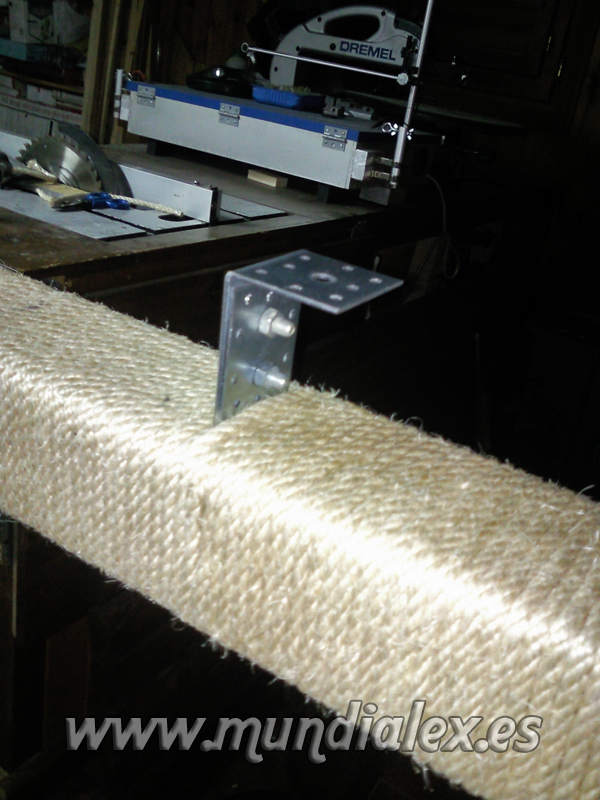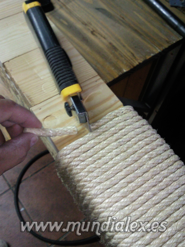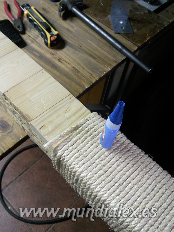 Una vez tenemos nuestro poste,pegamos el principio de la cuerda con loctite y aseguramos con una punta pequeña.Ya podemos empezar a dar vueltas con la cuerda alrededor del poste procurando siempre mantenerla bien tensa.