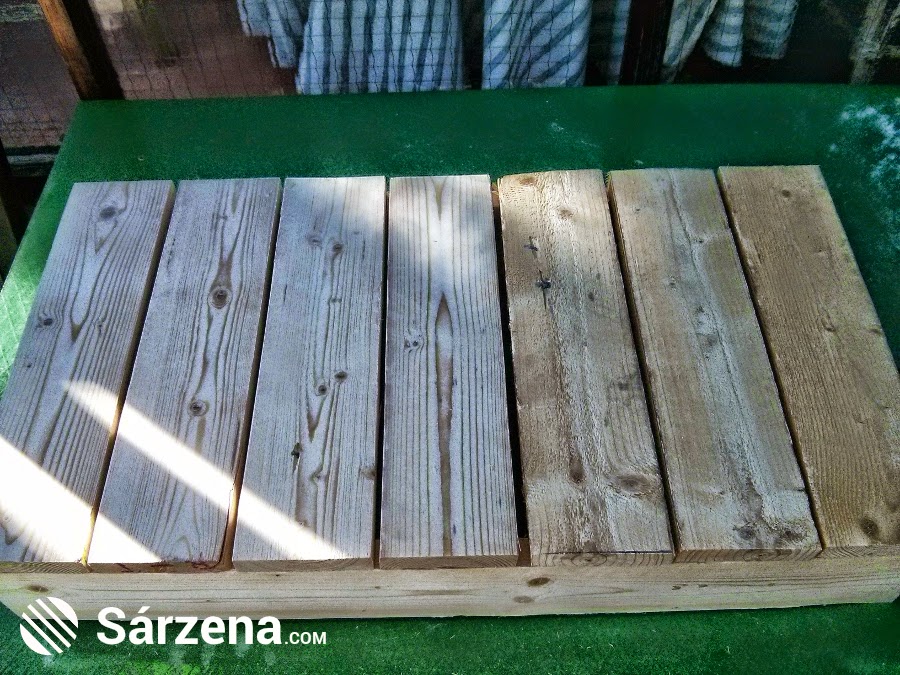 Lo primero que hicimos fue cortar la madera. A continuación la lijamos. Es madera de palet y en la imagen podéis ver la diferencia entre lijada y sin lijar.