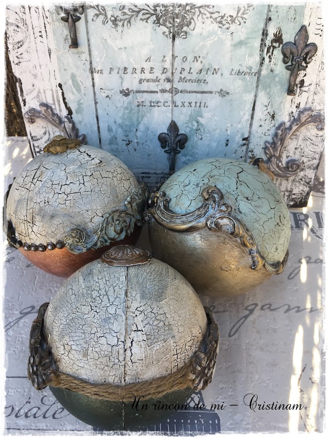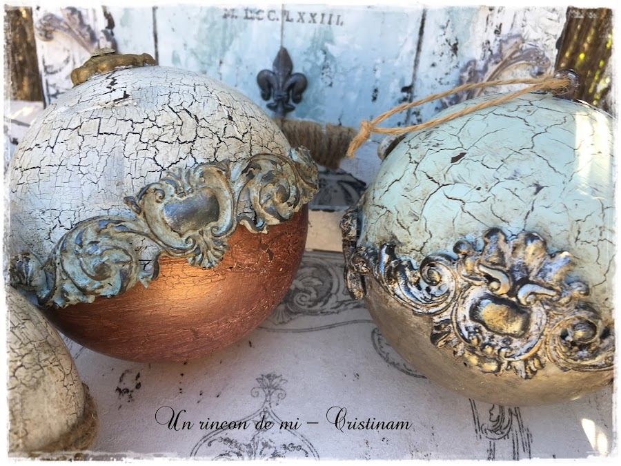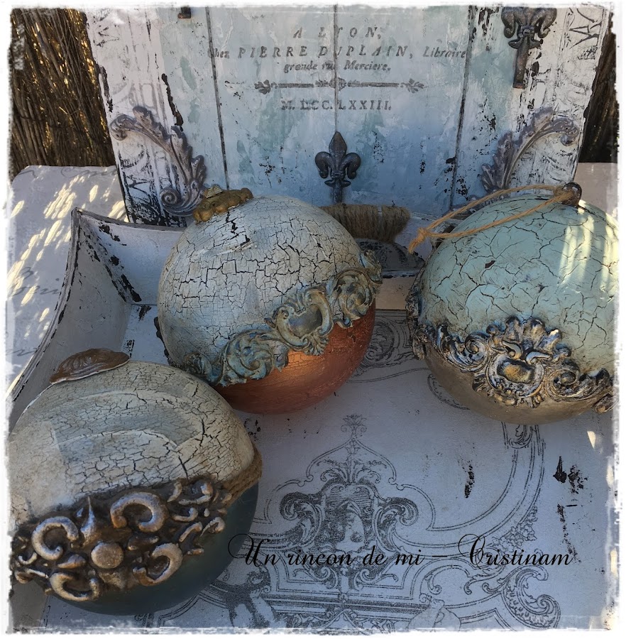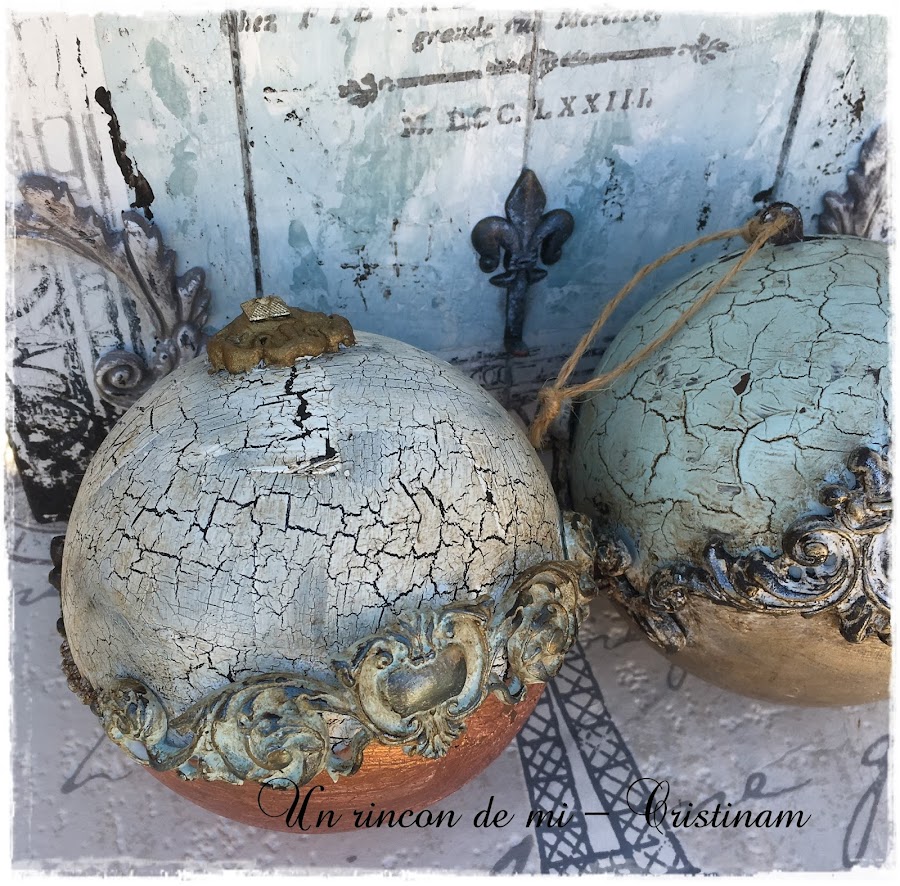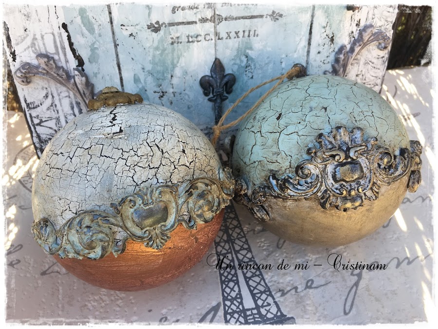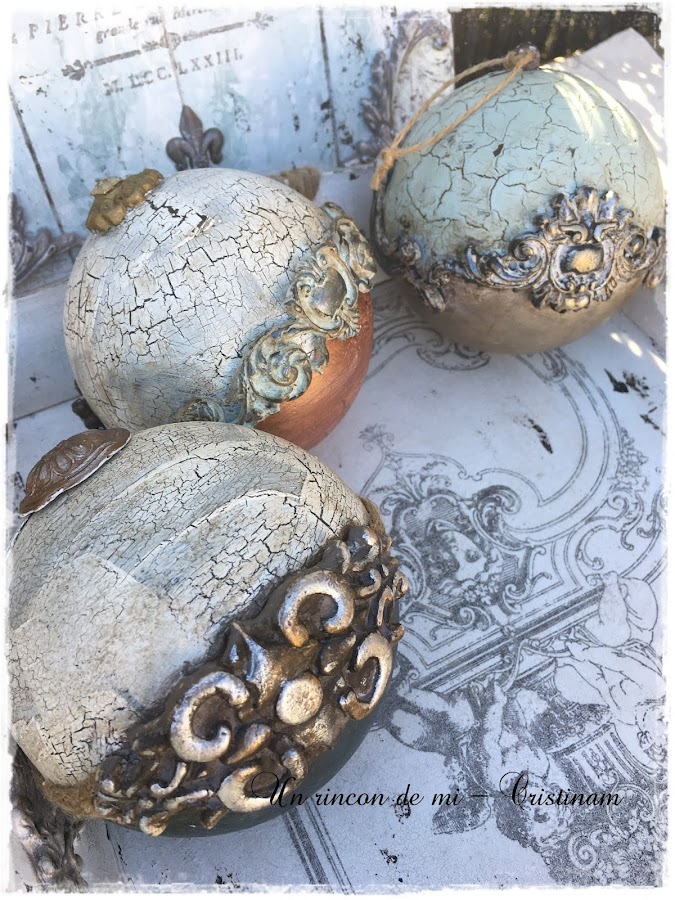 En esta entrada os muestro unas bolas de plástico que he decorado en este estilo que últimamente tanto uso.