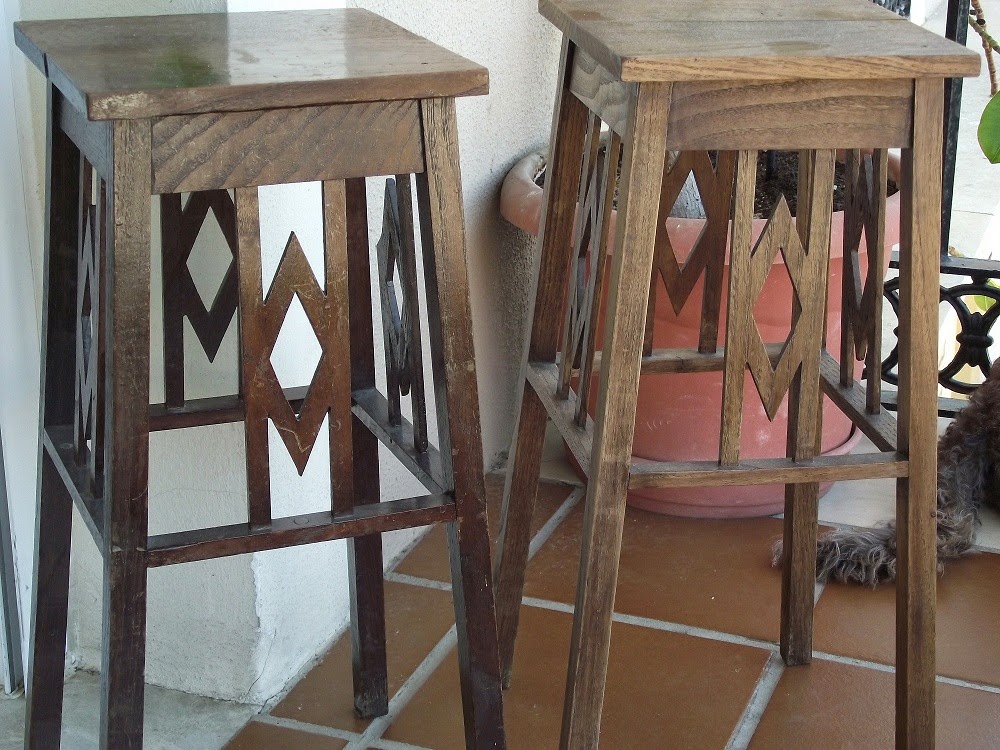 Para terminar una mano generosa de cera incolora, que protege la madera y le da un brillo satinado muy bonito. Al sobre además le di dos manos de barniz acrílico para reforzar la protección, puesto que se van a usar como mini-mesitas auxiliares. Y eso es todo.