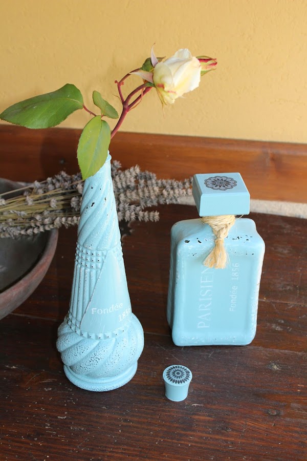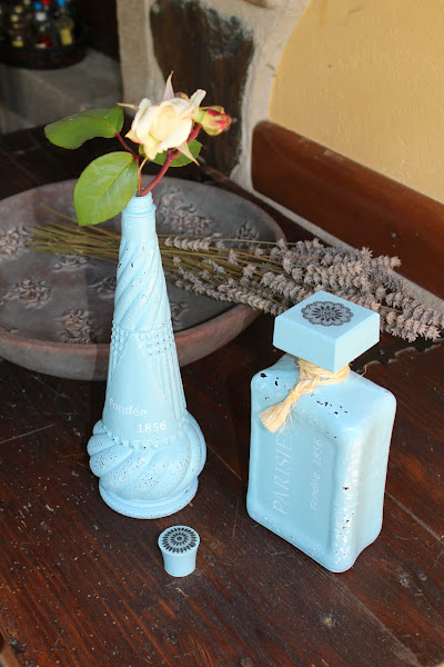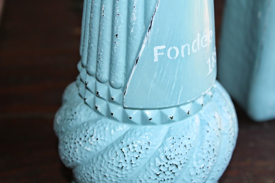 Les dí una mano de imprimación todo terreno (entrada anterior), dos manos de pintura que me había sobrado de pintar unas mesillas de formica, unos pequeños estarcidos con una plantilla de Lucía del blog MOMENTOS VINTAGE, un lijado fino con lana de acero, algún que otro adorno y este es el resultado.