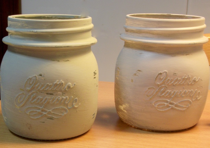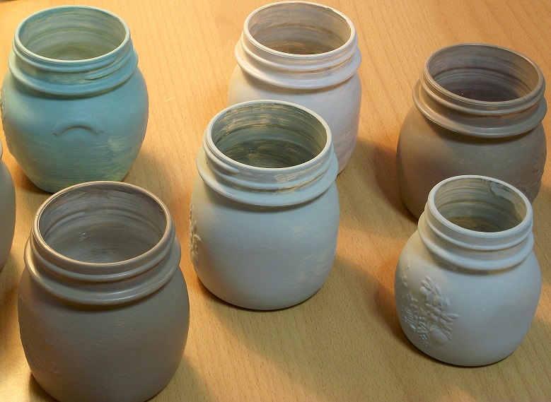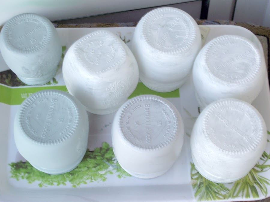 A los botes que iba a pintar con pintura acrílica les tuve que aplicar primero imprimación todoterreno, para que agarrase la pintura sobre el cristal. Es curioso porque este paso, que antes era obligado prácticamente en todos los trabajos, ahora me incomoda un montón, acostumbrada como estoy a las pinturas chalky que no necesitan imprimación jaja.