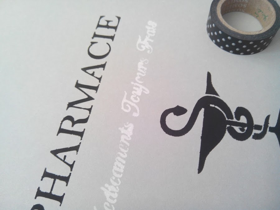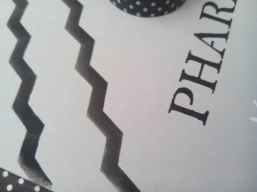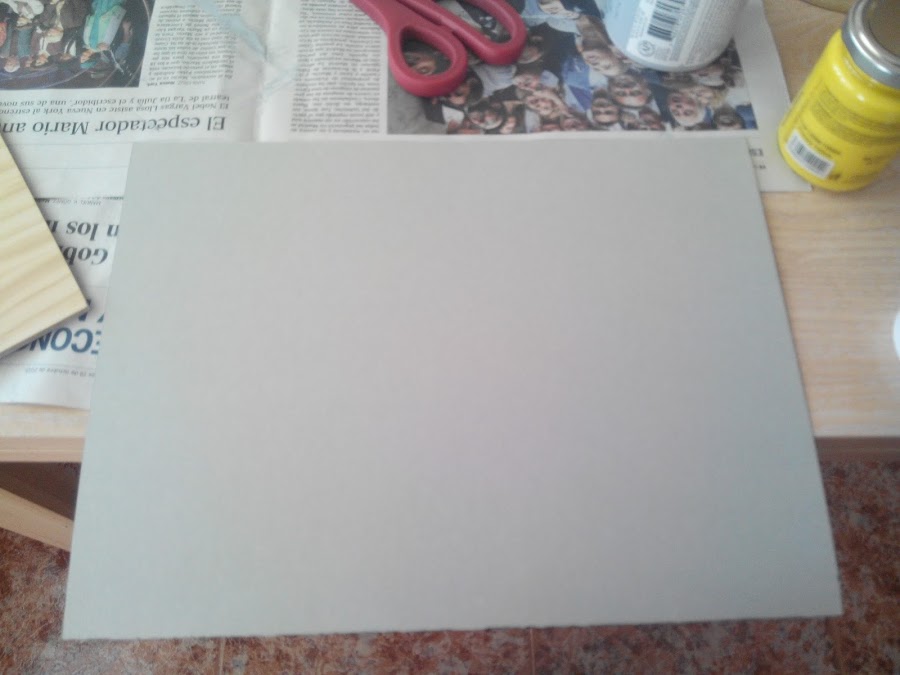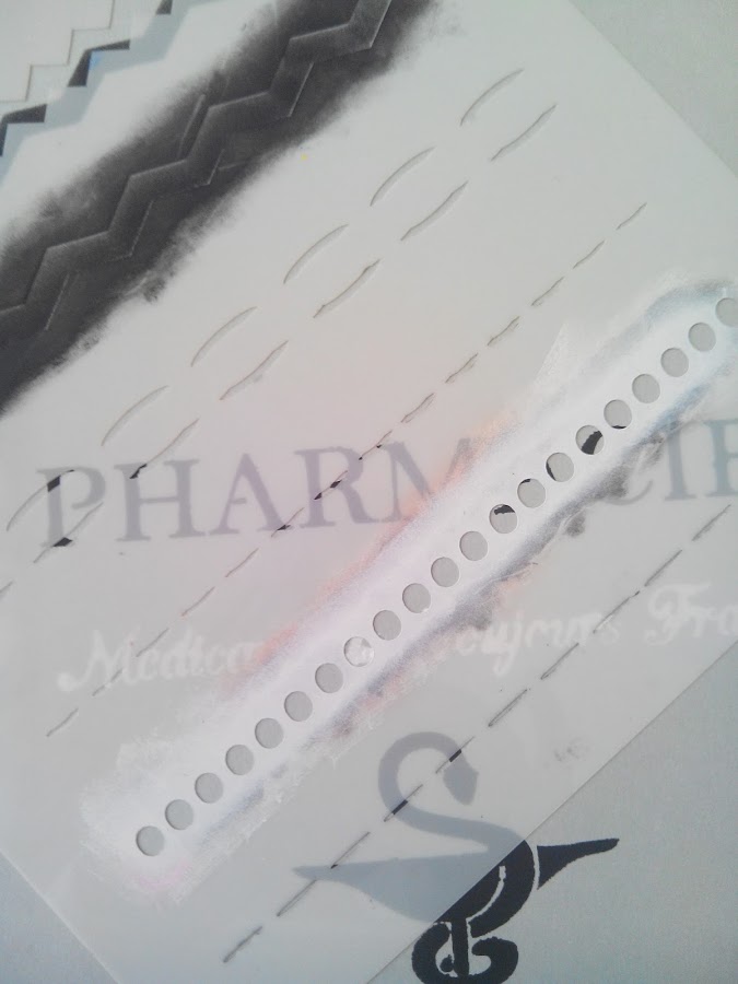 La tapa del Azpilicueta (buenísimo vino, por cierto) la cubrí con una cartulina de color grisáceo, que posteriormente estarcí con una plantilla que compré hace bastante tiempo y que todavía no había utilizado. Después la plastifiqué para que aguantara los trotes que pensamos darle. Aunque este tipo de objetos, mejor usarlos en mínimas dosis.