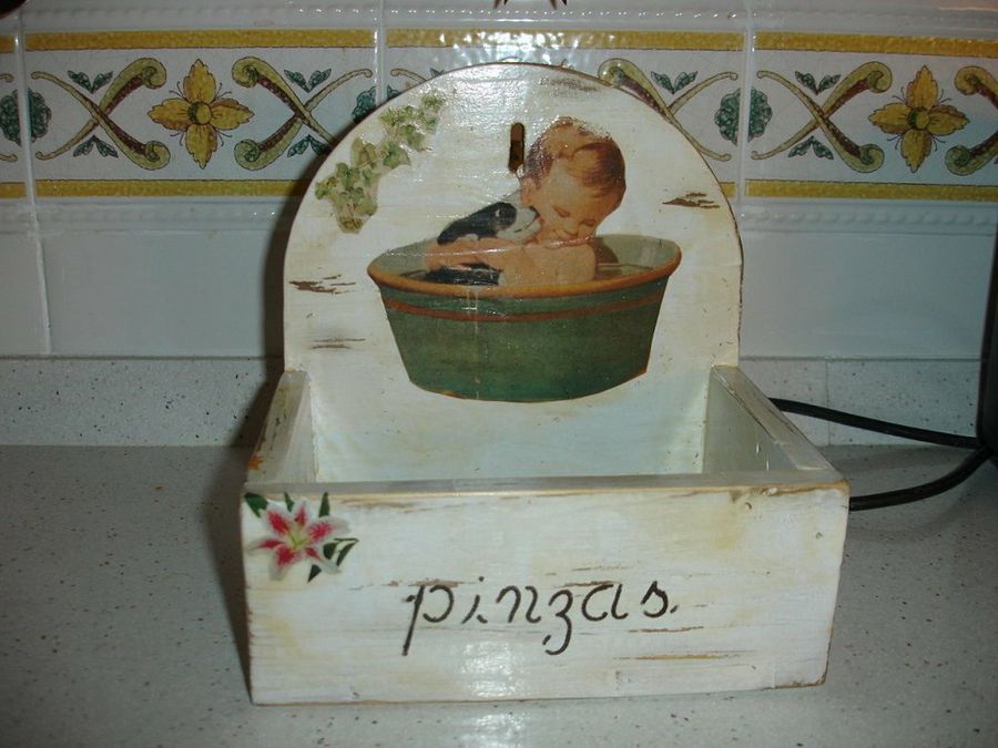 El adorno de Pinturas con este alegre mosaico fue también muy aplaudido. Tratándose de un gran artista de los pinceles, el trabajo de pintura es como podemos imaginar irreprochable. La madera va teñida de azul, generando un bello color verdoso por el tono amarillento del pino, y después lleva una mano de tapaporos y dos de goma laca.