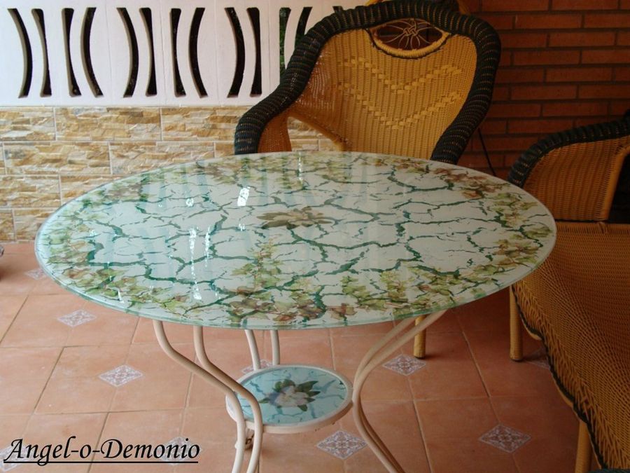 Angel-o-demonio firma otro sensacional tuneo en esta mesa de terraza. La artista, en un arranque de originalidad, ha elegido decorarla con la técnica del craquelado, que habitualmente se reserva para los adornos en el interior de casa. ¡Éxito rotundo!