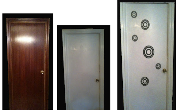 Como véis la puerta antigua era una puerta sobria, apática y aburrida. Eché dos capas de pintura blanca sin imprimación y una vez seca, compré estos vinilos decorativos por un módico de precio de 8 ?.