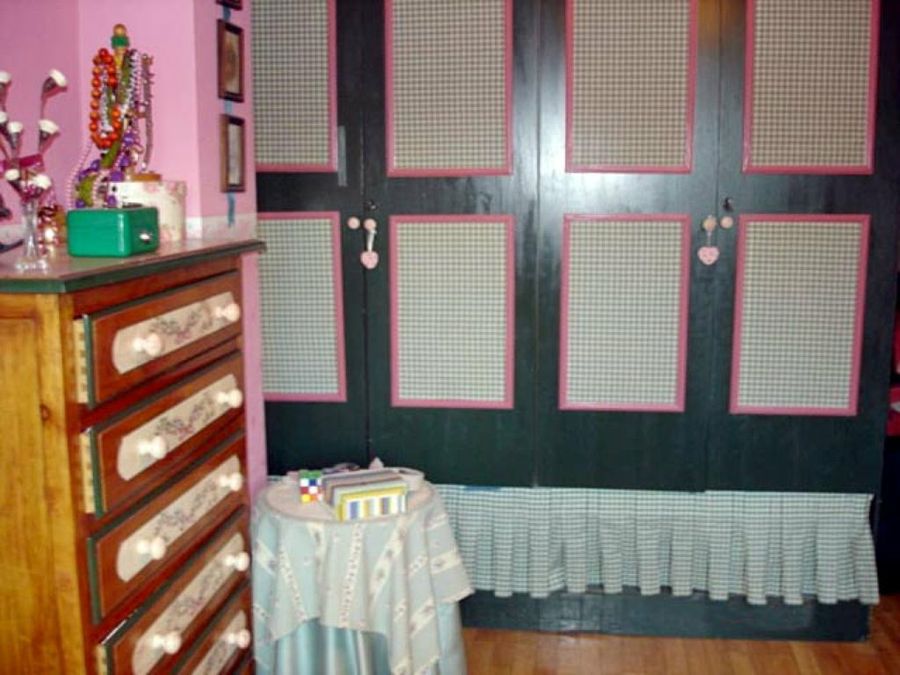 Nuestra amiga Galerna inscribió el cautivador dormitorio de su hija, que había reformado por completo. Todo lo pintó ella, incluyendo las paredes y las flores del zócalo. Al armario, originalmente liso y de color nogal, le puso cuarterones con molduras y después los forró con tela.