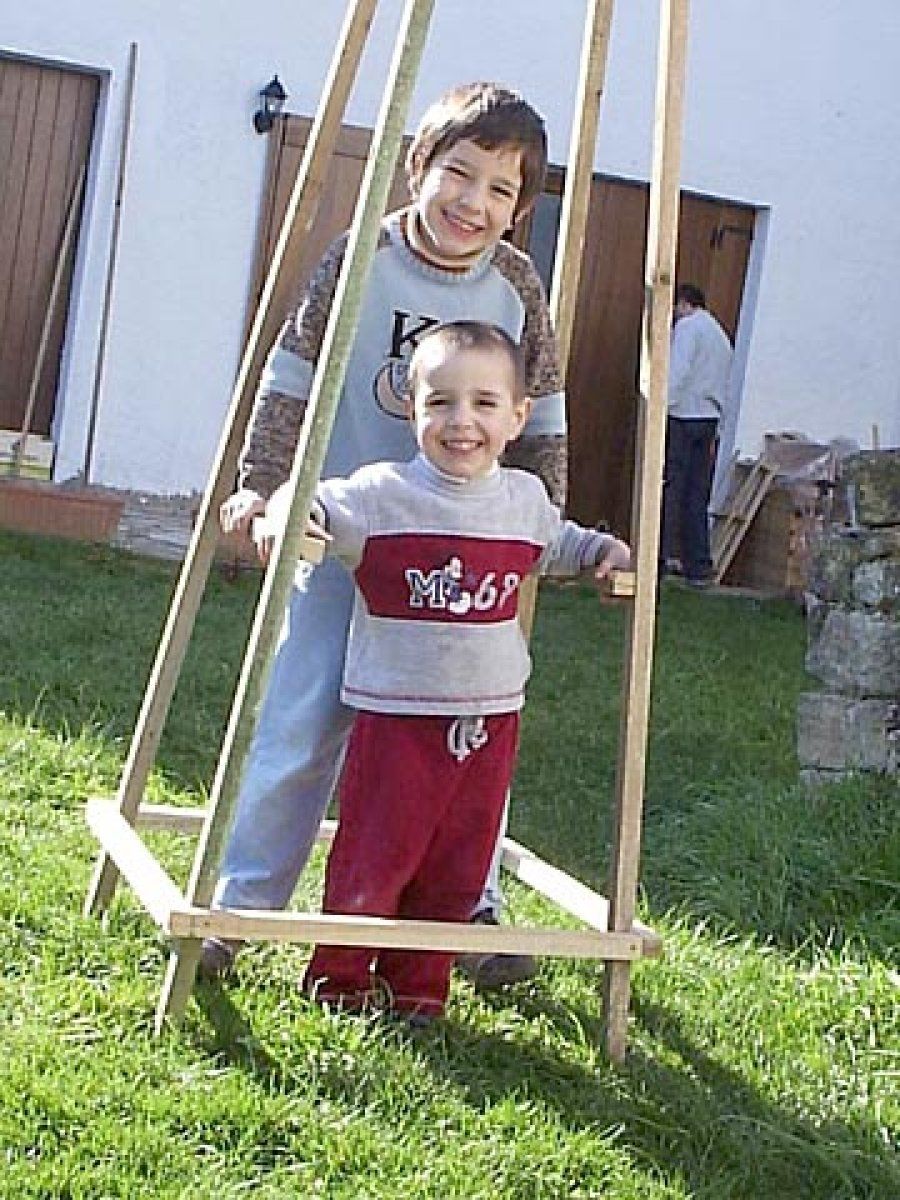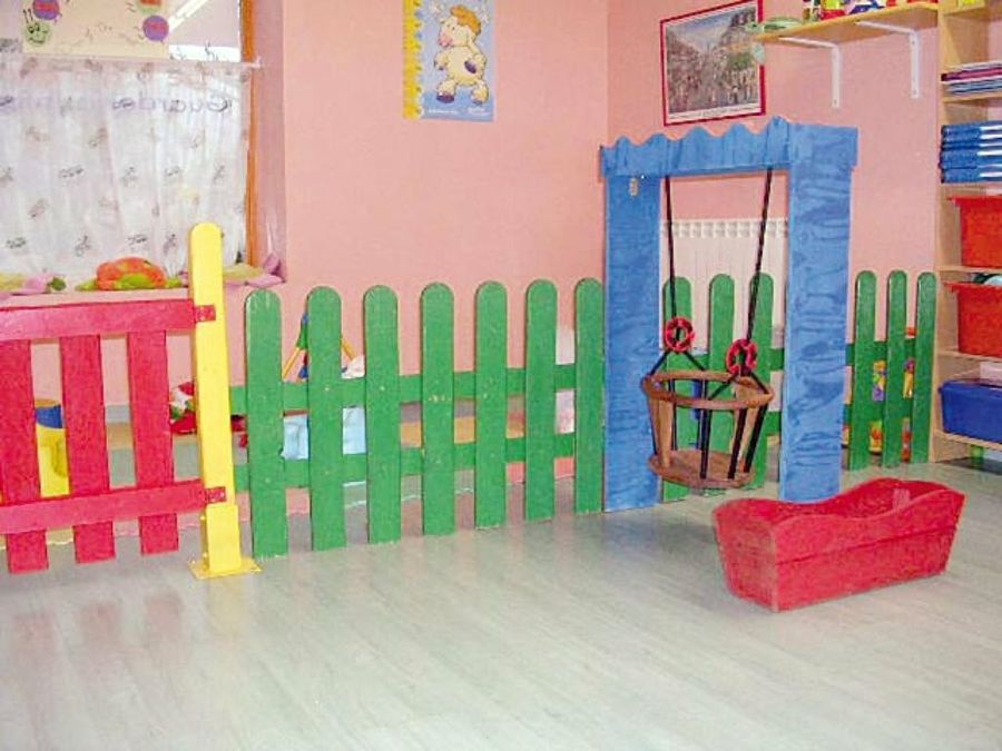 Segundo trabajo presentado por Eme de Anta: otra zona de la guardería con vallado, columpio y una jardinera, que sirve de juguetero. El arco del columpio está hecho con tablas de contrachapado y fijado al vallado y a la jardinera; el conjunto va sujeto al suelo para darle estabilidad.