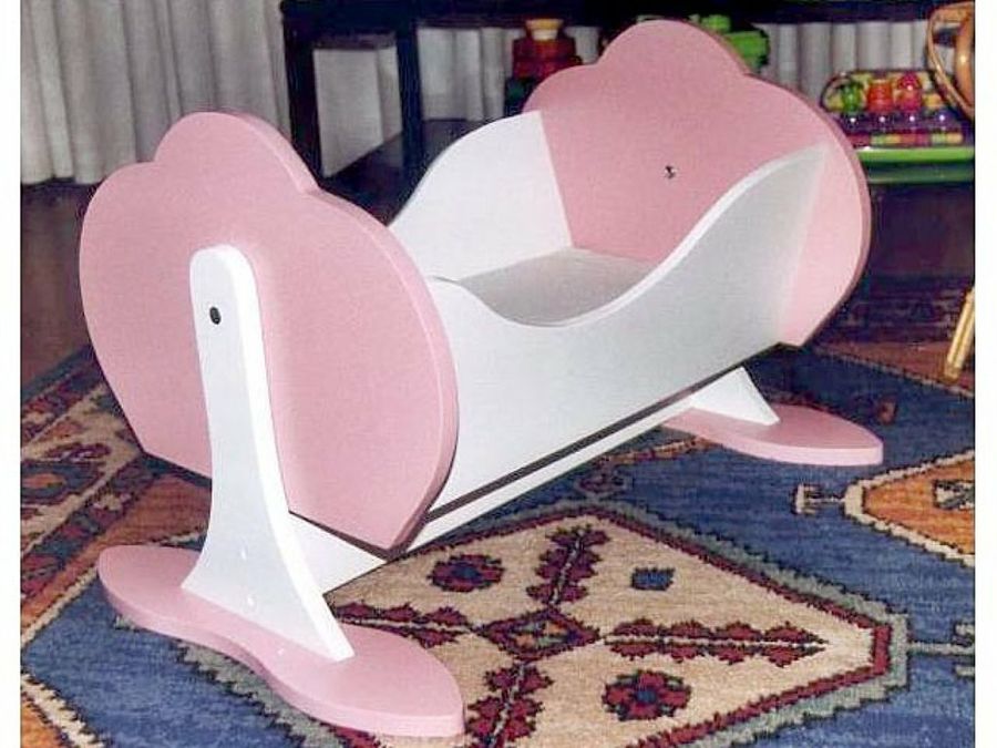 Con esta preciosa cuna, Escuadrilla hizo su entrada en el concurso. Diseño de cuento, con líneas curvas muy elegantes, y pintada en suaves tonos: la cuna es un magnífico trabajo de carpintería, cuya estructura adivinamos muy resistente.