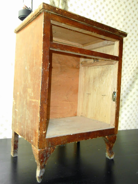 Aquí presento a la "reliquia" elegida para este primer proyecto. Como se puede observar venia sin puerta ni cajón. por lo que me facilitaba las cosas para dejar correr la imaginación, la madera estaba bastante deteriorada y muchas de las piezas "abombadas" por la humedad, a favor decir que no tenia ni rastro de carcoma y que quitando la tapa de arriba y el contrachapado de la parte de baja todas las demás piezas podrían ser salvadas.