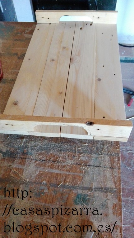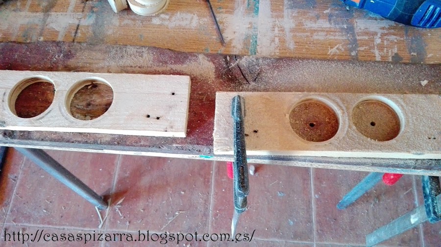Luego hice las asas, con piezas de madera de 30 cm de largas por 7,5 cm de anchas, los huecos para poder sujetar la bandeja son dos cortes circulares en cada una de las asas, hechos con una broca de corona de 5,5 cm,