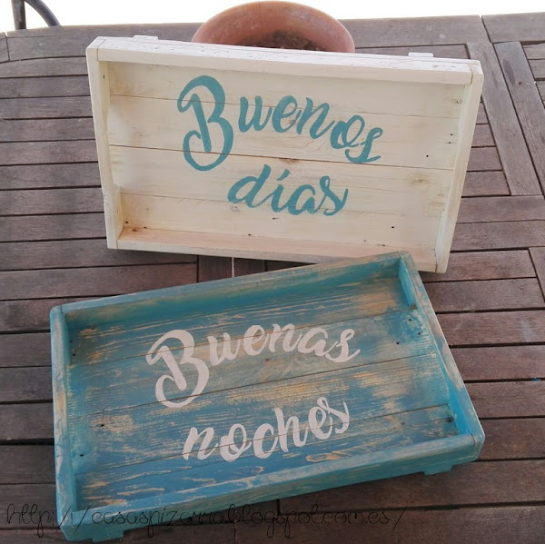 Sólo quedaba adornarlas, sobre la blanca escribimos en color azul "Buenos días", y sobre a azul "Buenas noches" con pintura blanca