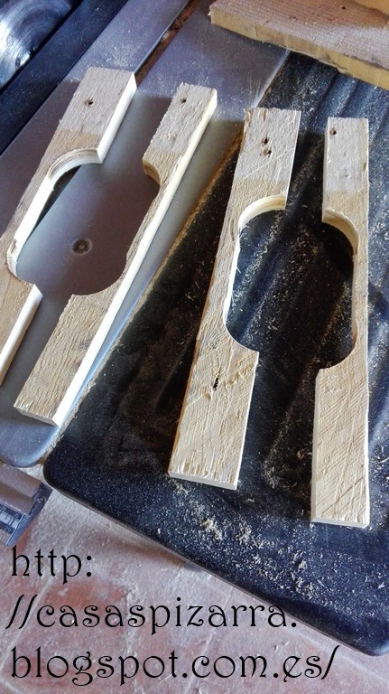 Con la sierra de calar recorté la madera que se quedó entre los dos huecos, y luego corté esas tablas a la mitad