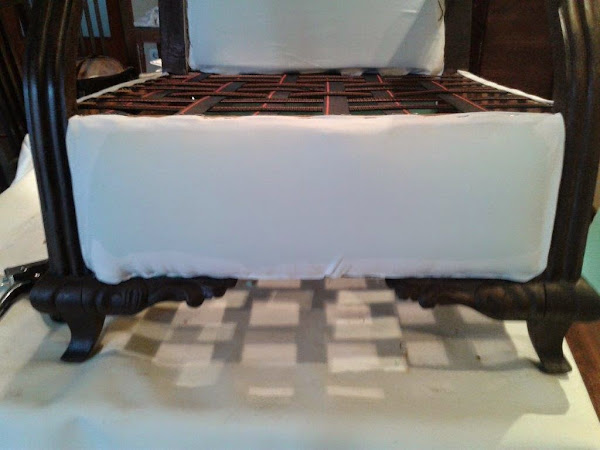 Ahora tocaba el resto. Poner las cinchas en el asiento y respaldo e ir haciendo el relleno con espuma, guata y forrado con tela de sábanas blancas. De esta forma queda más protegido.