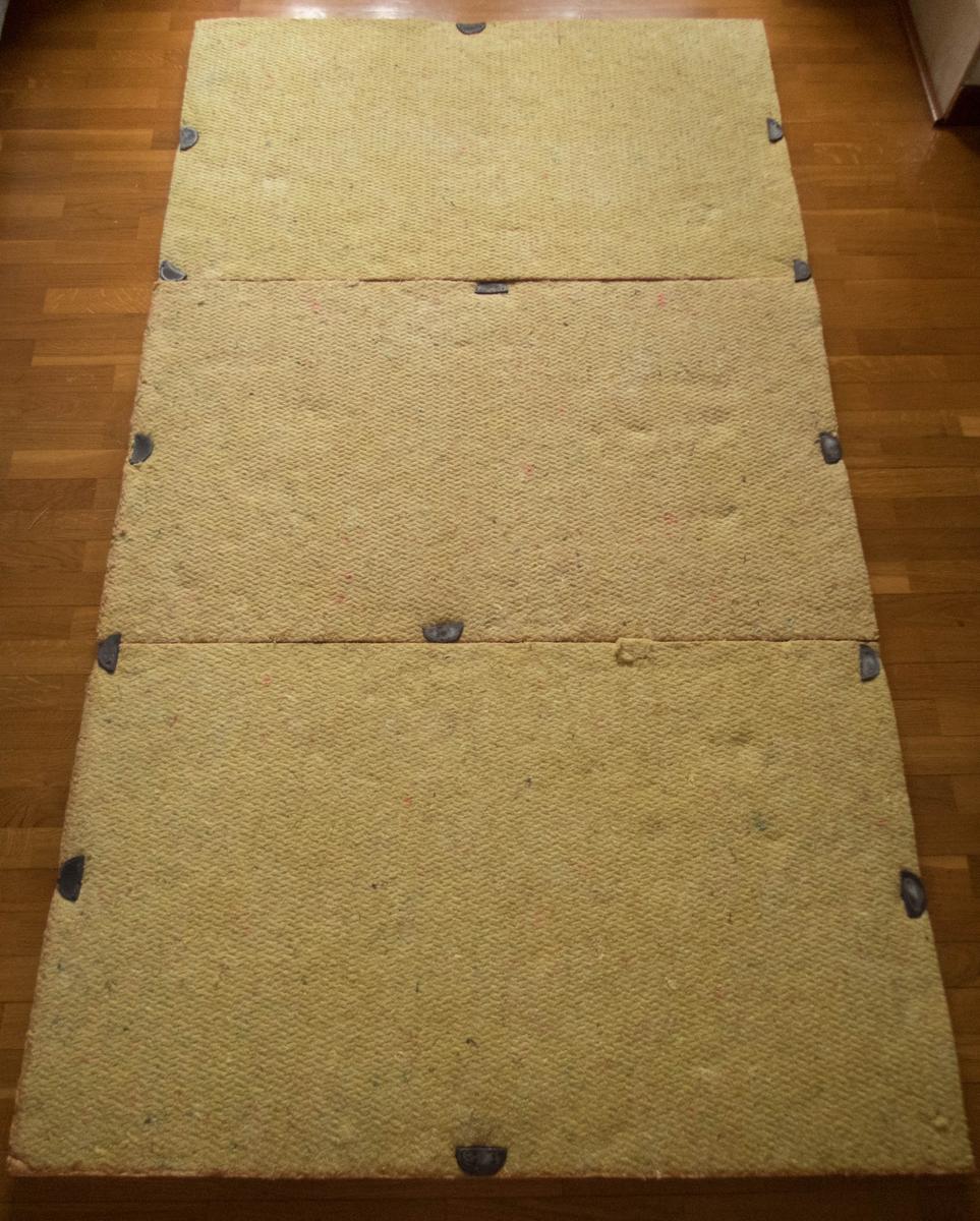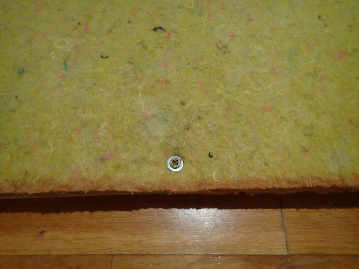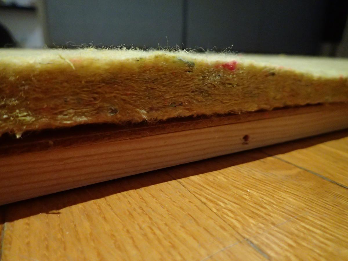 En primer lugar fijaremos a la estructura un panel de espuma, los hay de diferentes tipos y tamaños por lo que hay que adaptarlo a la medida de nuestro cabecero cortando el sobrante y añadiendo donde se necesite. Nosotros hemos usado geopannel comprado en bricodepot. Esta parte es importante ya que el efecto del capitoné depende del grosor que usemos como relleno. Lo hemos unido mediante tornillos y arandelas que después hemos tapado con un cacho de espuma pegado para evitar durezas en el cabecero.