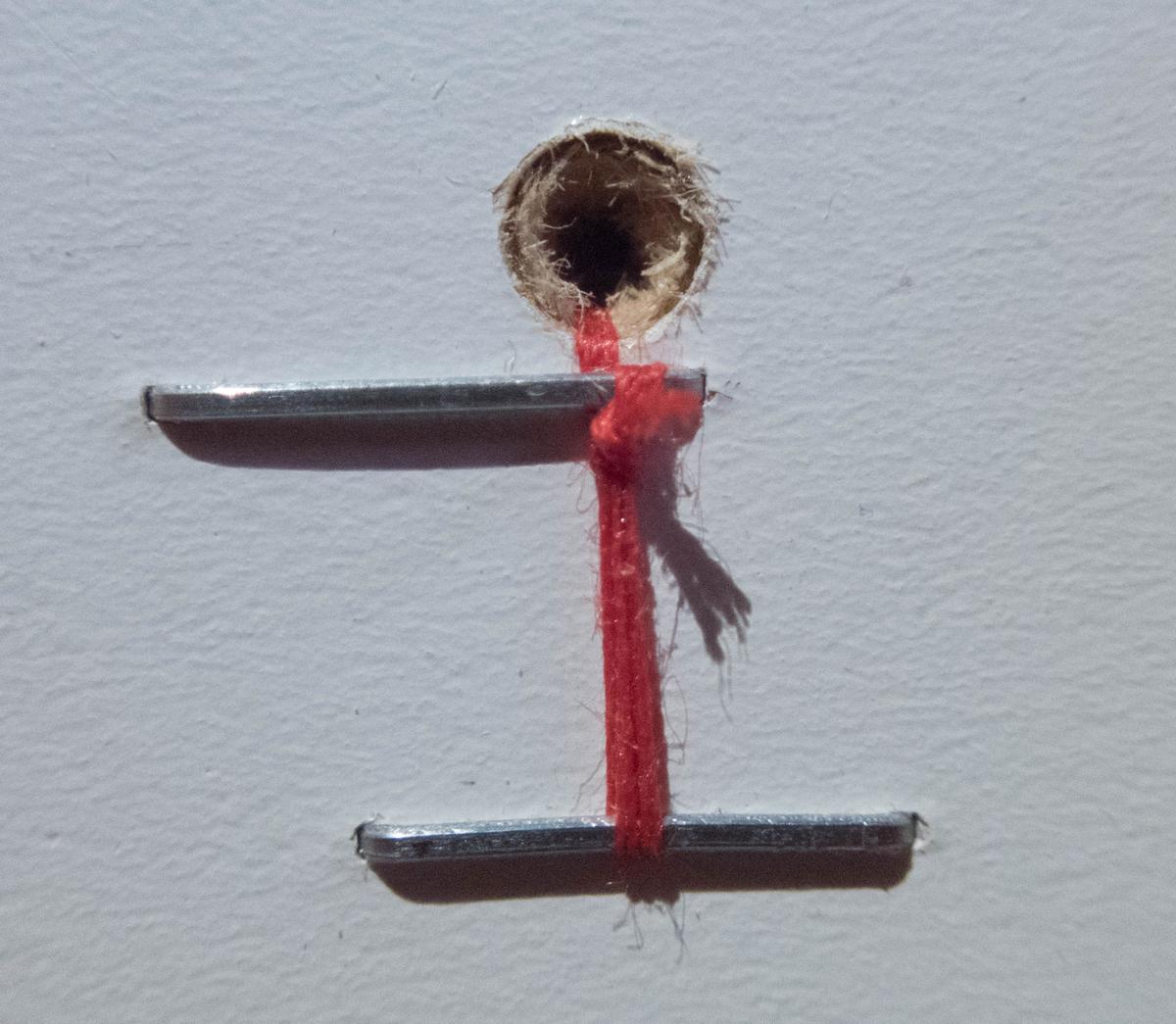 Los botones han de quedar lo más tirantes posible, de otra forma no conseguiremos el efecto capitoné, por lo que usaremos un hilo en doble o un hilo grueso para evitar que se rompa al tirar. Pasamos el hilo con una aguja larga (si vuestro relleno es muy grueso necesitaréis agujas de colchonero) sujetando el botón y a su salida por donde está el tablón lo sujetamos mediante grapas y lo anudamos para que no se escape.