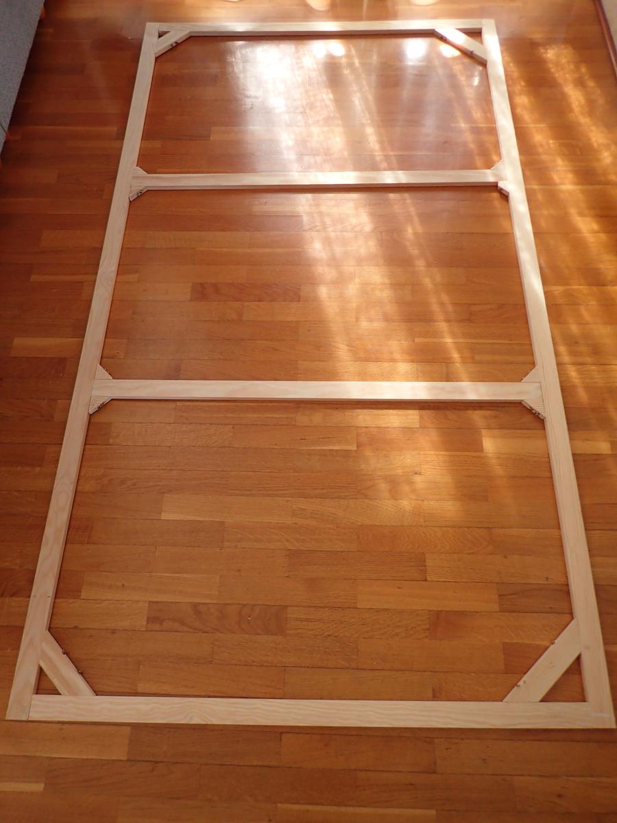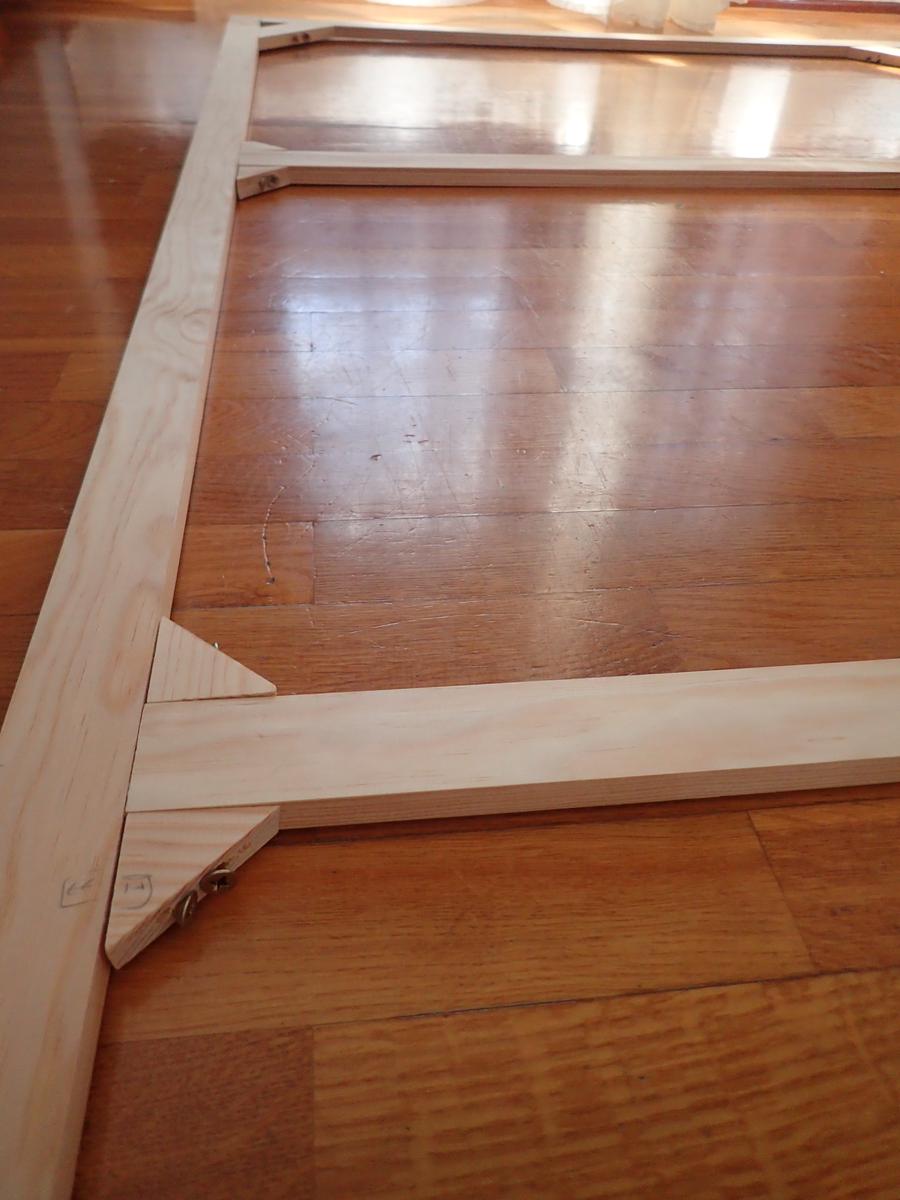 Esta estructura rectangular la realizaremos primero cortando los listones de madera del alto y largo necesarios para nuestro cabecero, y después encajando unos con otros mediante escuadras de madera (hechas con el sobrante de los listones) y tornillos o clavijas de madera.