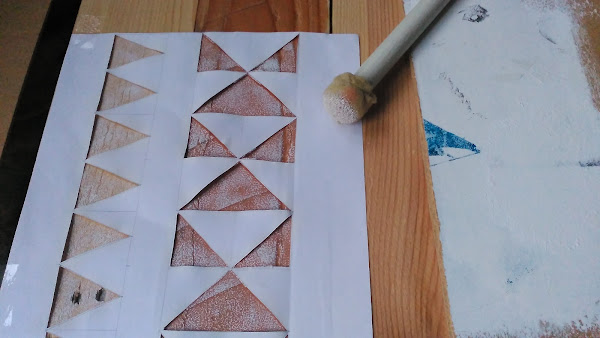 Primero hice en un folio lo que sería la plantilla (con unos dibujos geométricos) para hacer el estarcido sobre la madera, lo cual haría con pintura blanca.