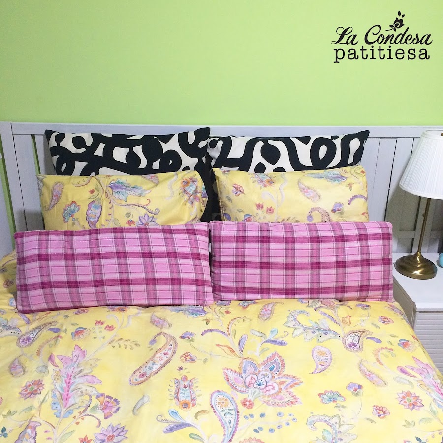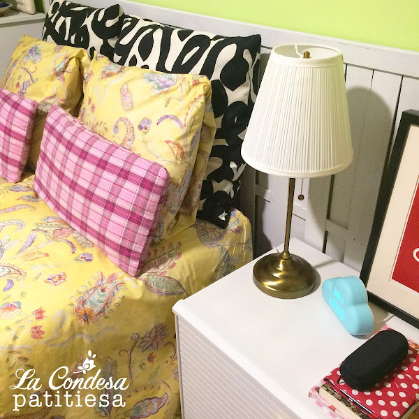 Y así lo tengo colocadito, como mide 180 centímetros es más grande que mi cama y sobresale un poquito que es algo que buscaba a propósito para que se viera más y que no lo tapasen del todo las montañas de cojines que tengo puestas delante. Quizá con el tiempo intente subirlo un poquito pero del otro lado tengo una cómoda alta (que os la enseñaré más adelante) y no quería sobrepasarla de altura...
