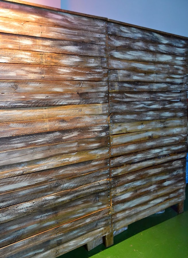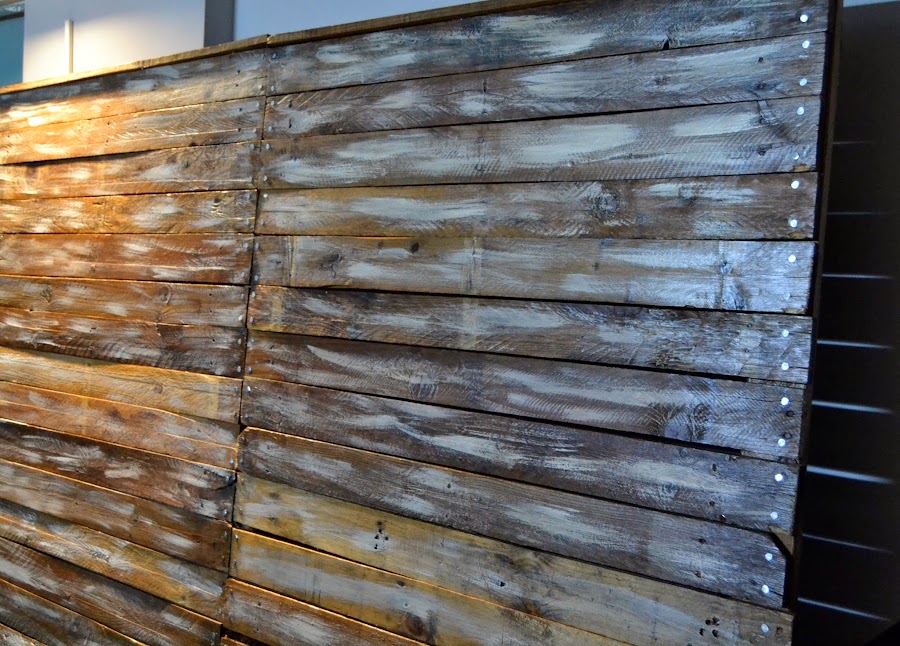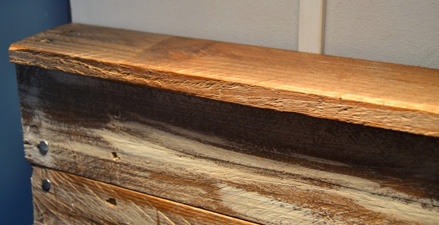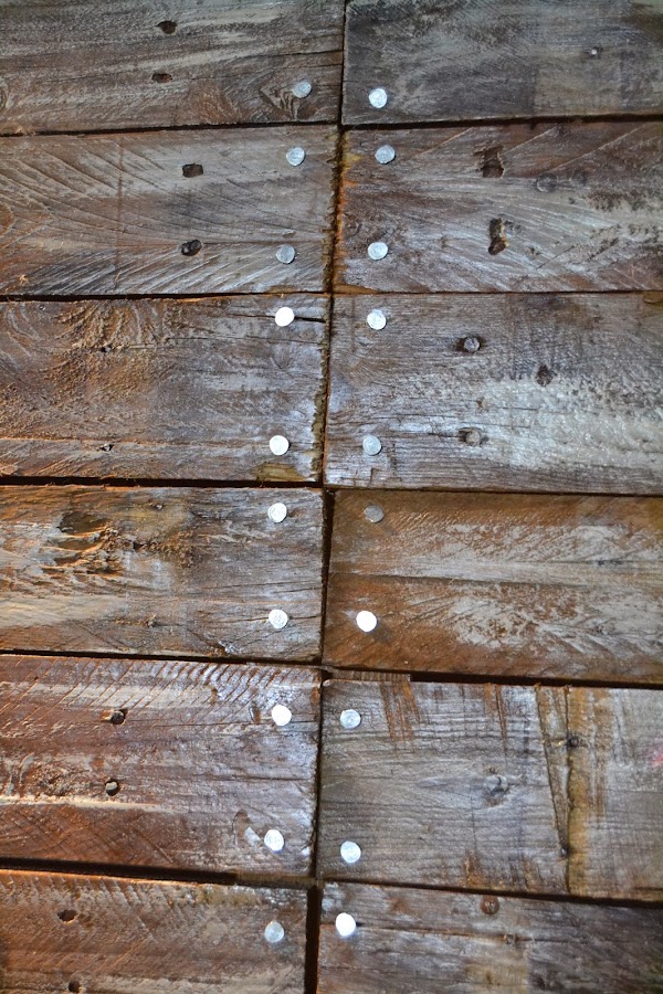Una vez clavadas todas las maderas, les hemos dado unas pinceladas de pintura y decapado un poco. A continuación la capa de barniz satinado. Y para rematar, compramos unos clavos con la cabeza grande, y los hemos ido poniendo encima de las puntas que sujetan las maderas.