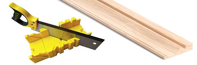 Nuestro tablero mide 140 cm así que para obtener la pieza superior marcaremos en la moldura de madera con un lápiz a 2 cm y a 140 cm siempre en la parte de arriba. La pondremos en una caja de ingletes y con el serrucho procedemos a cortar con el angulo hacia adentro de la caja (lado izquierdo) por la primera marca que está a los 2 cm (al dejar un poco de margen es más fácil realizar el corte). Luego movemos el listón hasta la marca de 140 cm, y cortamos con el angulo hacia adentro por la derecha y conseguimos una pieza como esta.