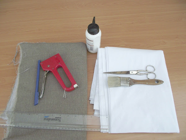 Para hacer el cabecero tapizado he necesitado los materiales que os enseño. Antes de nada quiero dejar claro que esto NO es un tutorial, yo no sé apenas nada de tapicería, sólo os cuento cómo lo he hecho por si puede ser de ayuda. Los tutoriales que pongo otras veces son sobre temas que conozco y controlo, pero en este caso sólo es un "apaño" xD (aunque ya veréis que no quedó mal del todo). Bueno, esto he necesitado: