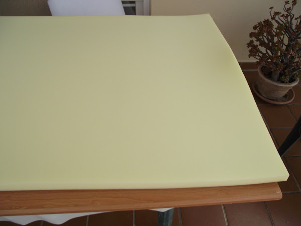 Ahora extendemos sobre la mesa la plancha de miraguano y encima el tablón, con la espuma ya pegada hacia abajo.