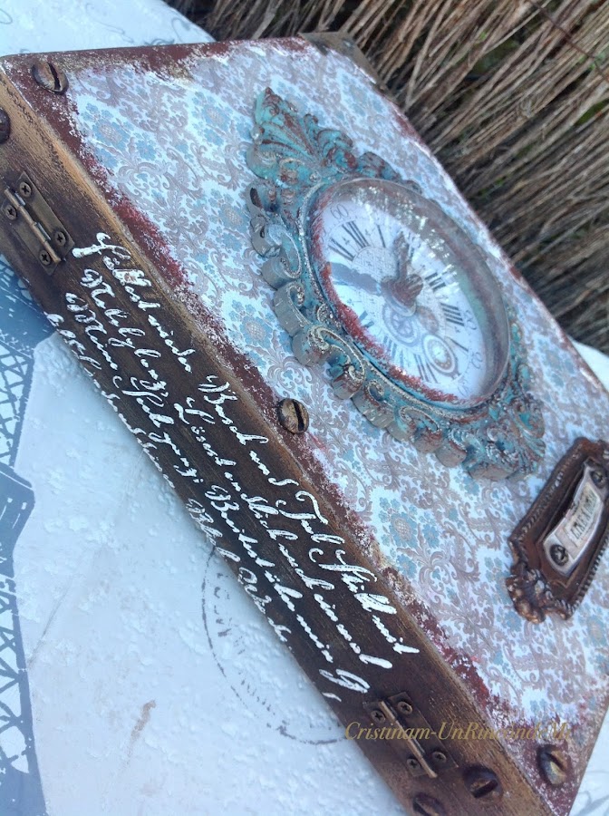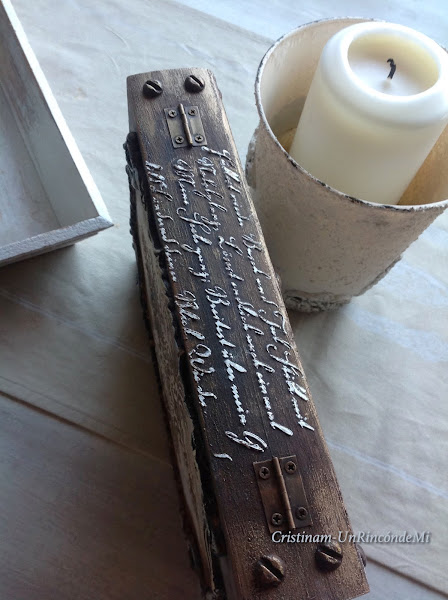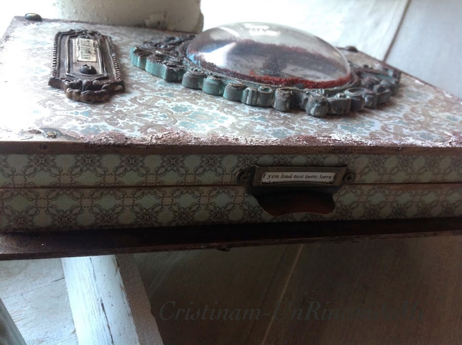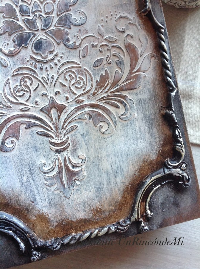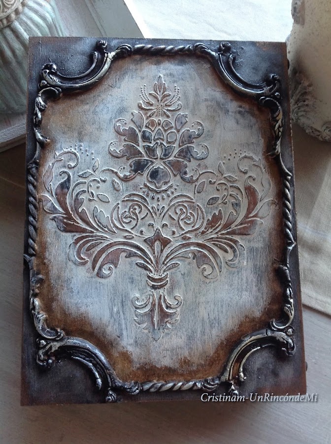 En la parte trasera de la caja he realizado una composición de moldes y stencil para conseguir un acabado estilo paneles antiguos . Creo que ha quedado ideal!!