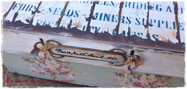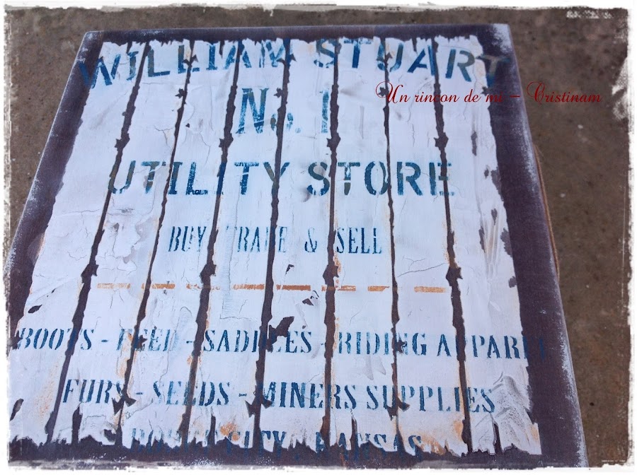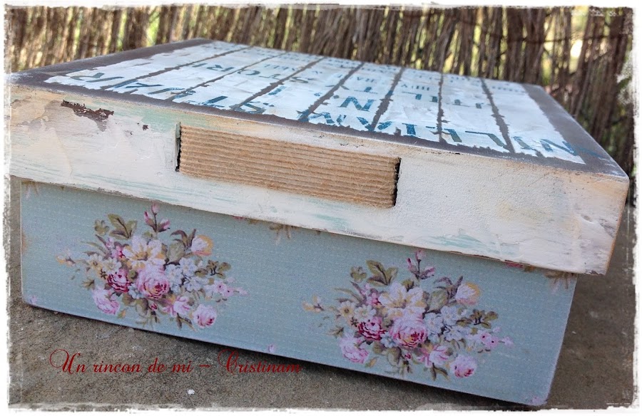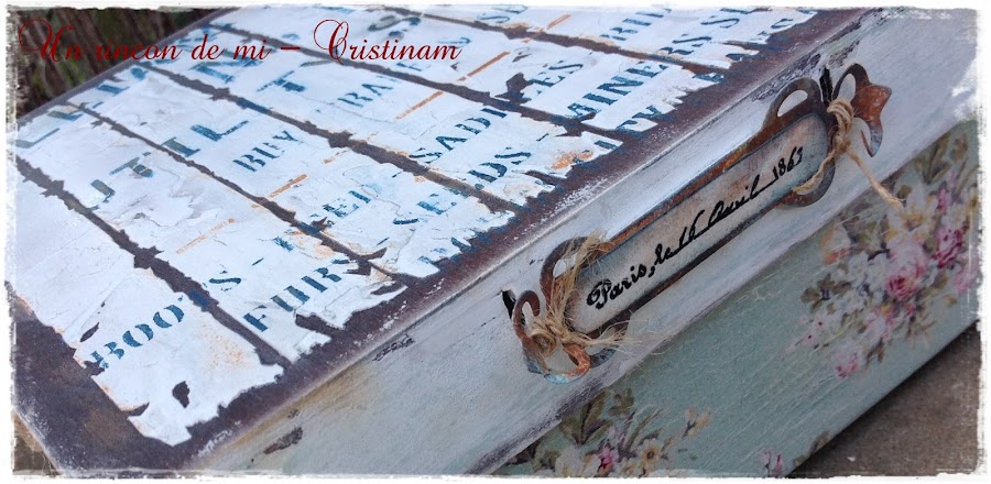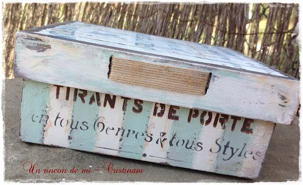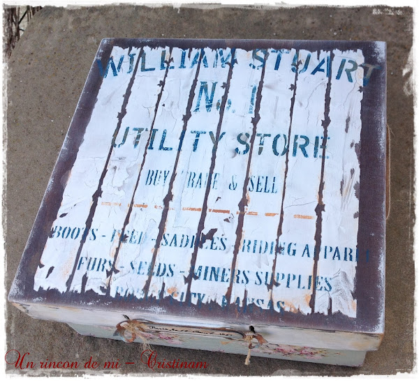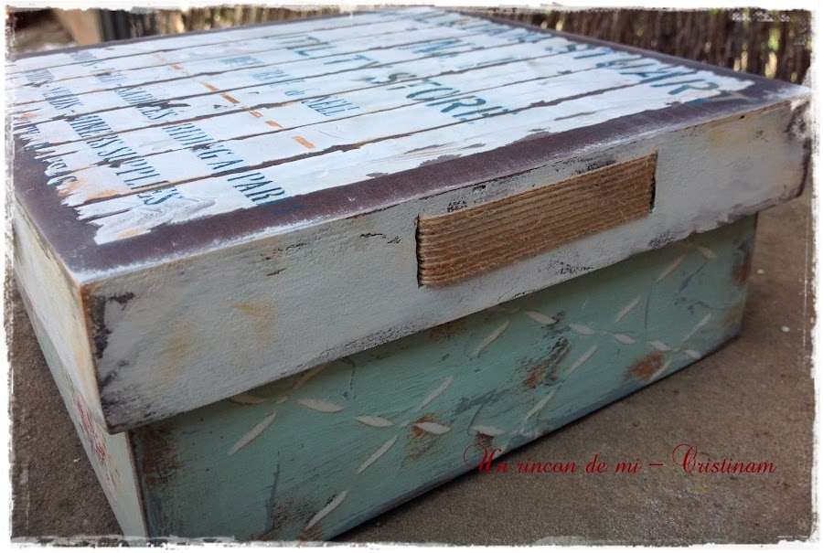 En la tapa he puesto un stencil que imita las rallas vintage y luego otro de texto encima , todo muy rústico.