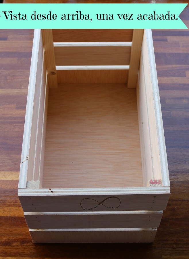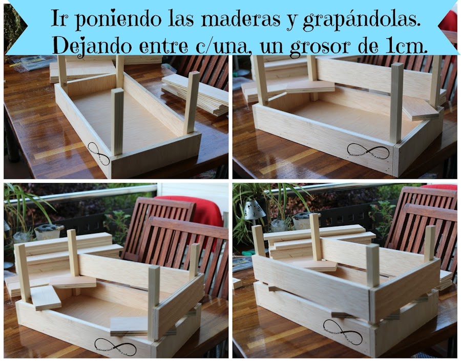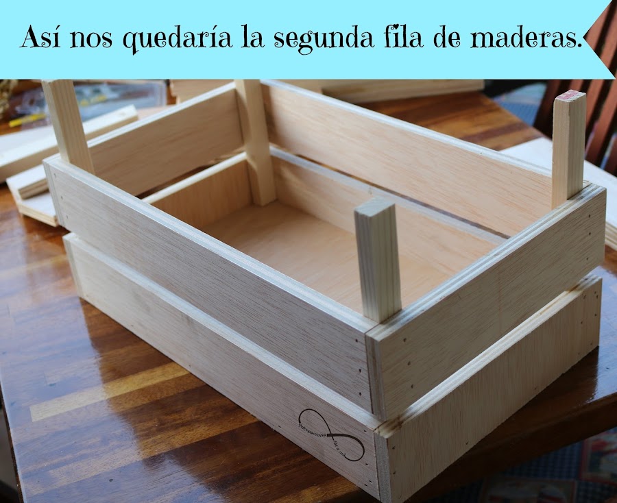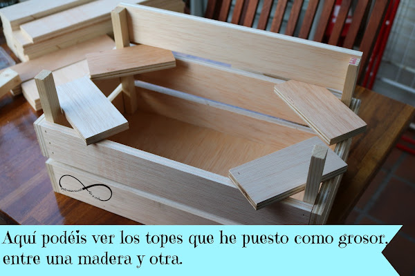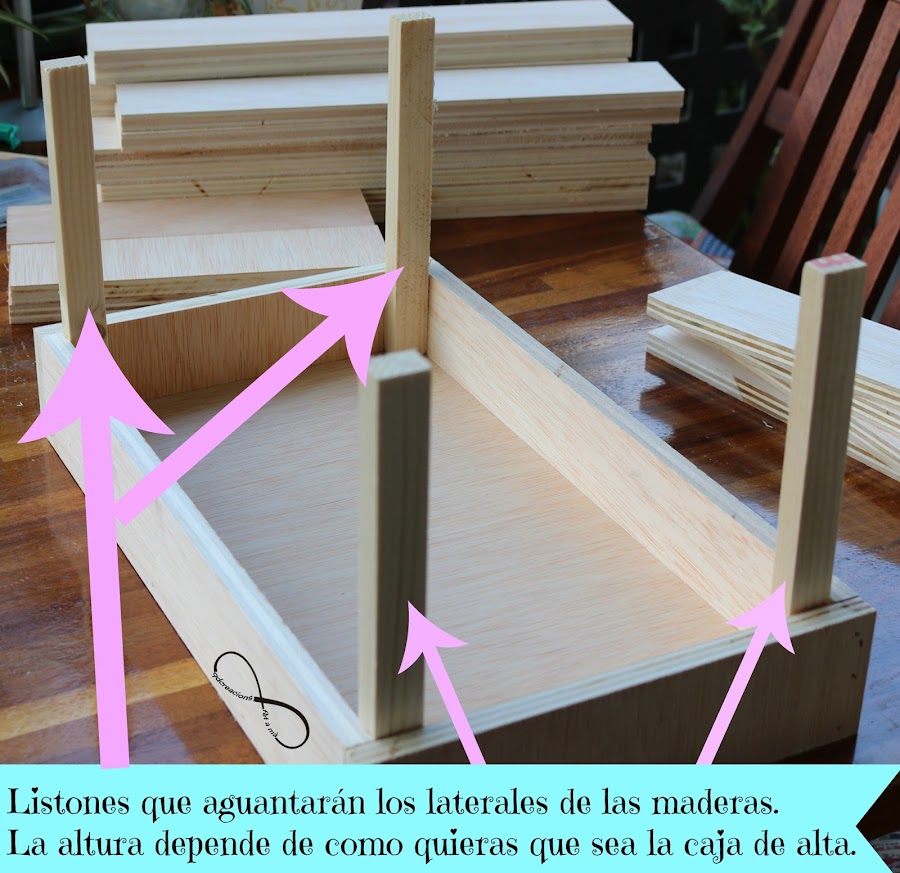 Esta foto os la pongo para que veáis que si queréis hacer la caja en dos alturas, los listones que son las maderas que sobresalen, las tendríais que hacer más cortas, por ejemplo de 11cm.