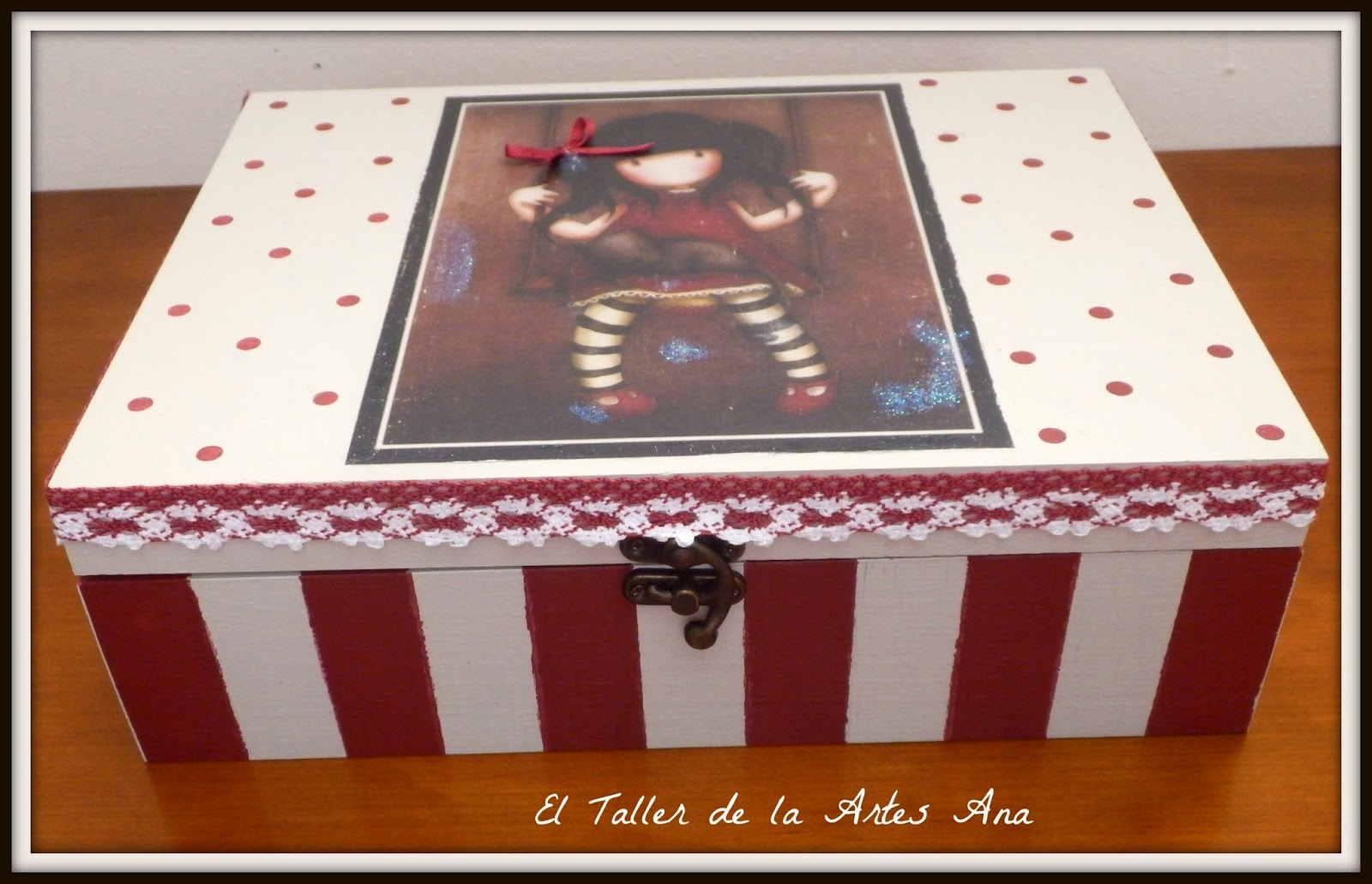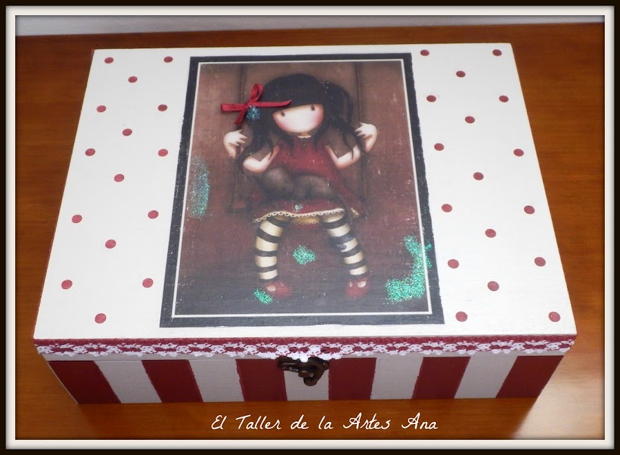 Y por último os enseño otra que hice para una chica de 14 años por lo que decidí poner la imagen de una gorjuss que me encantan. La parte superior con lunares y la inferior de rayas. Los colores el blanco antiguo y el rojo garnacha de Mary Paint.