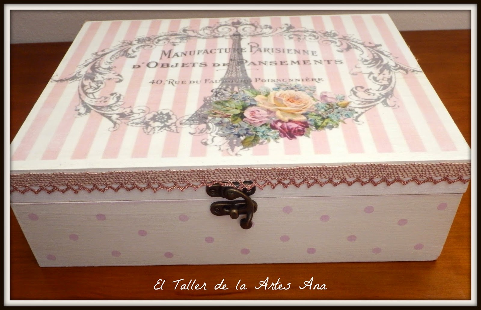 Ahora os enseño otra caja joyero para una chica que ha quedado muy dulce. En la parte superior he transferido una preciosa imagen y en la parte inferior he pintado del blanco antiguo de Mary Paint y después he pintado unos lunares rosa. He rematado con una cinta ideal.