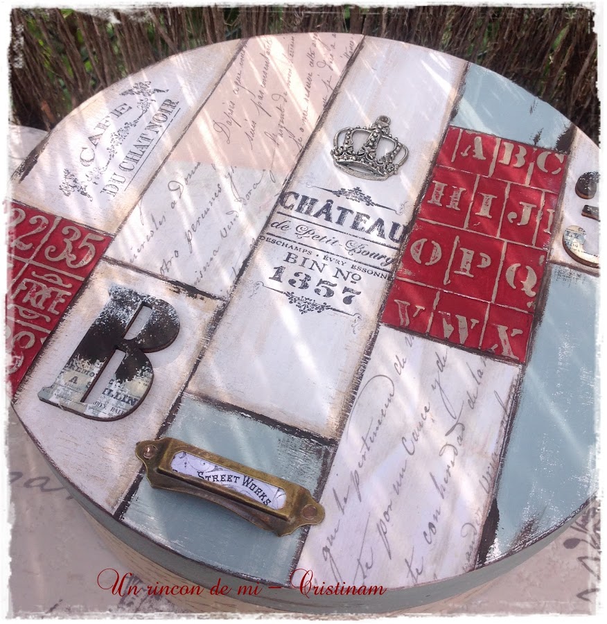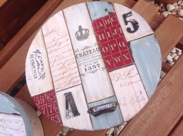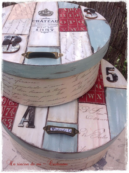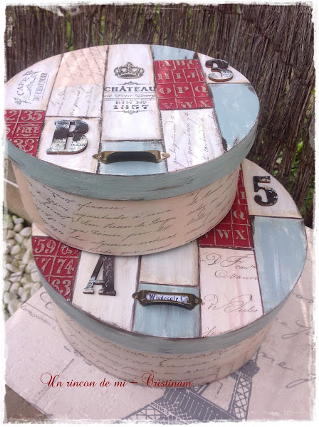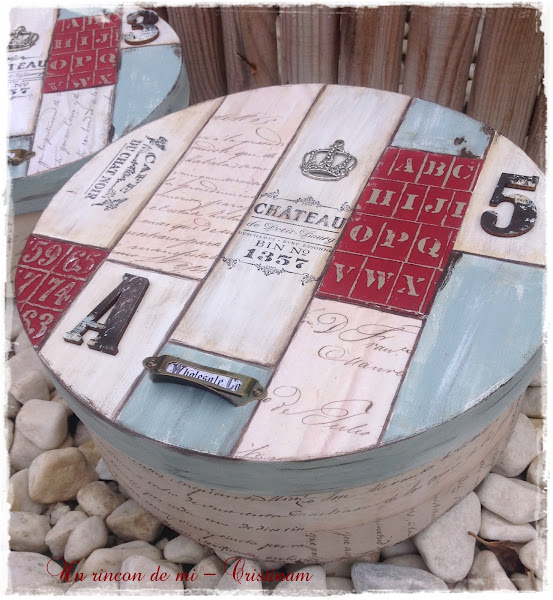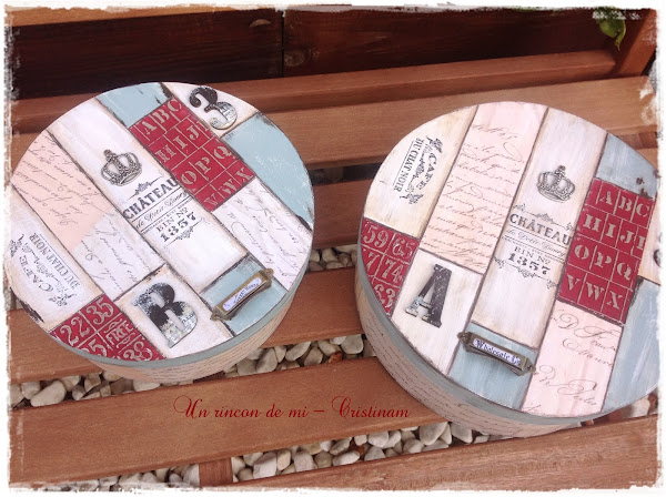 Me decidí por hacer unos presentes para las anfitrionas y para ello decoré dos cajas de madera redondas.