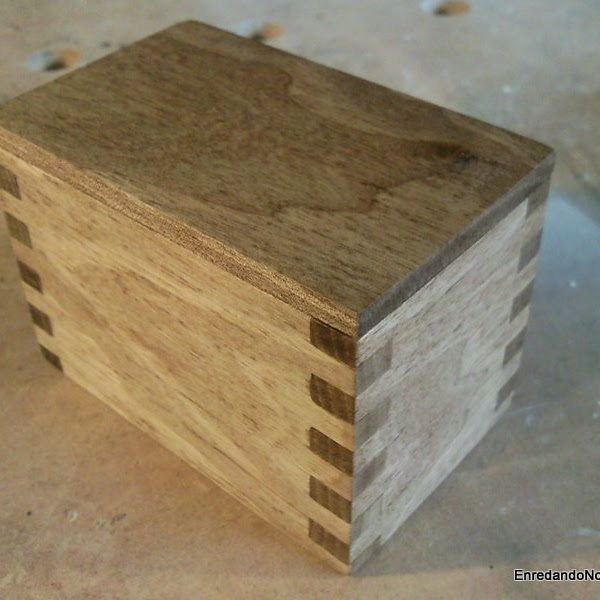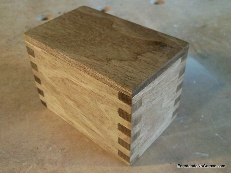 Este es un "caixoncito" de nogal. Bueno, una pequeña caja de nogal con tapa. Para fabricarla utilicé un trozo de madera de nogal que recuperé de la leñera. Este se salvó de la hoguera y ahora me arrepiento de no haber guardado más trozos antes de quemarlos. Por lo menos aún tengo los de roble que usamos para quemar en la cocina de hierro de la casa rural.