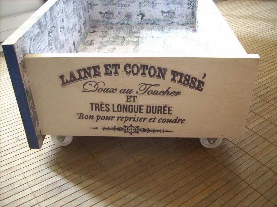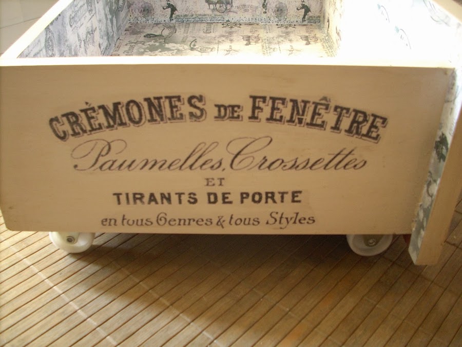 Todo el cajón está hecho con la técnica de la transferencia y con motivos industriales. Tras darle varias capas de imprimación lo pinté en blanco roto. Finalmente de di a todo el cajón una pátina para envejecer.