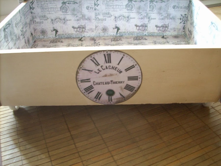 Y la parte trasera del cajón. El motivo del reloj es decoupage.