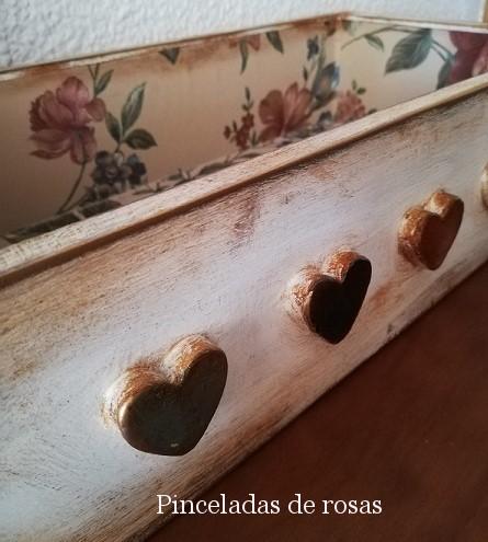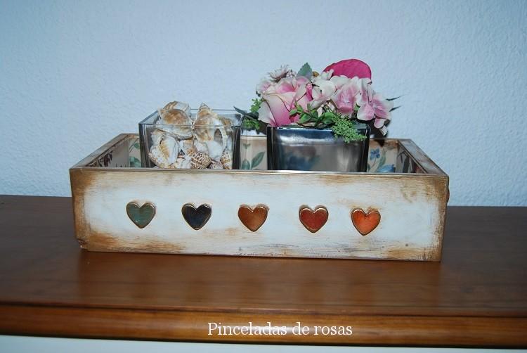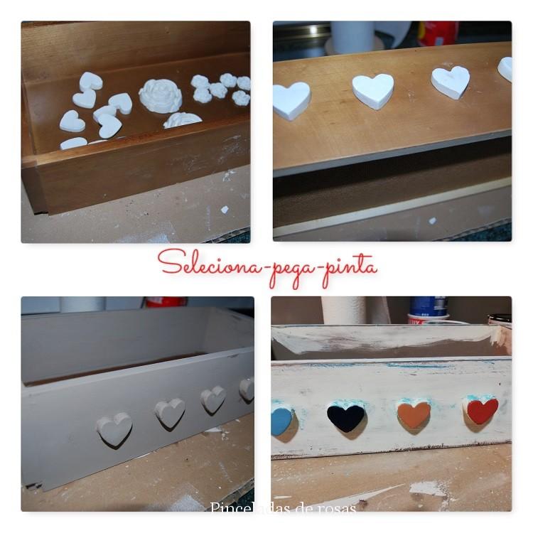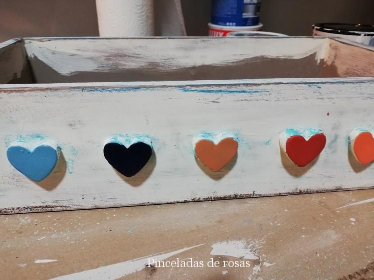 En un lado los corazones, cada uno pintado de un color diferente y de estos mismos colores doy ligeros toques a pincel seco sobre la parte plana