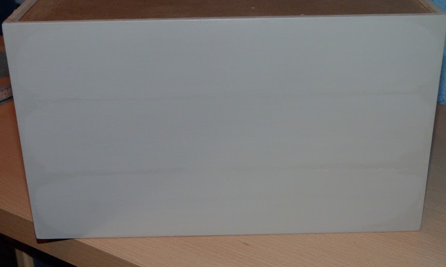 La parte superior está pintada en el mismo tono. Después de lijar, he aplicado una pátina de cera teñida en blanco con blanco de titanio. Es un polvito blanco que con sólo una pizquita tiñe la cera incolora.