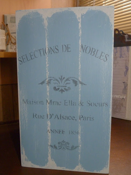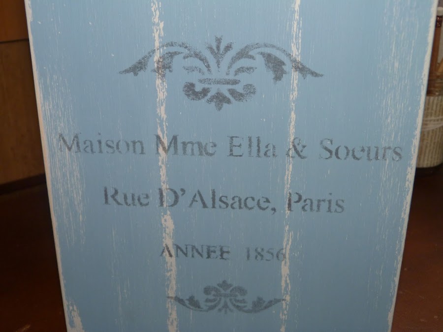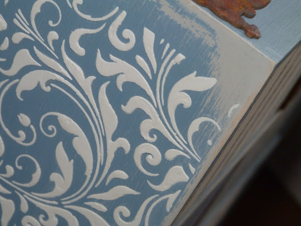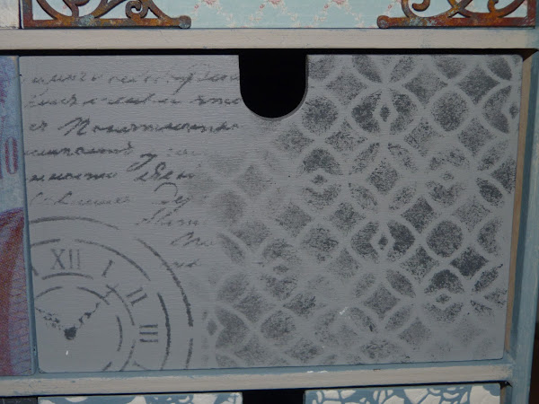 Encima, pinté con el azul parís y desgasté con lija. Después, hice un estarcido con una plantilla de Momentos Vintage.