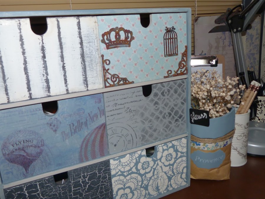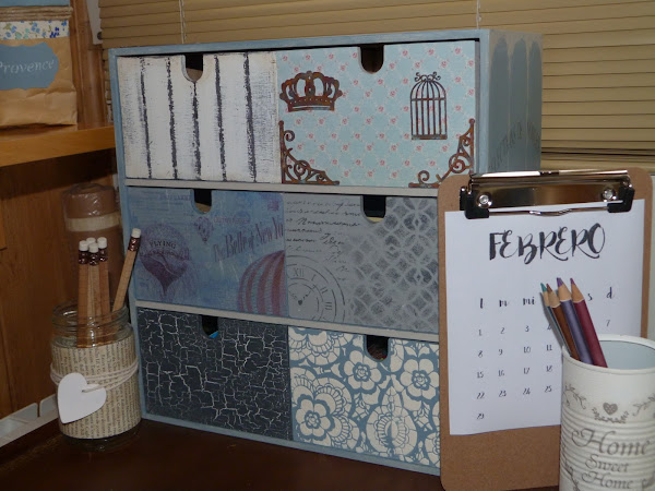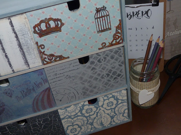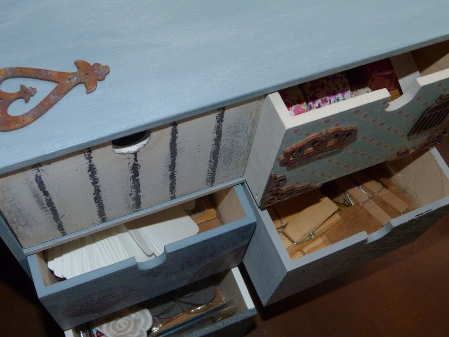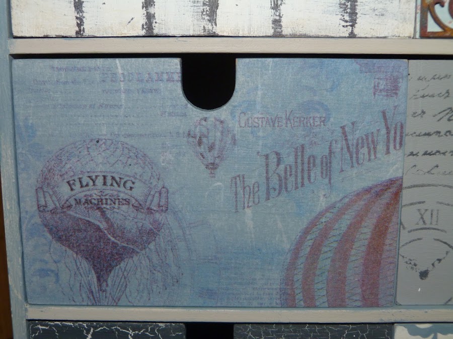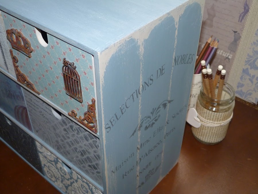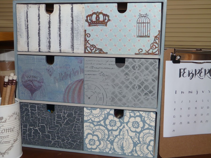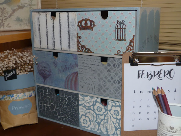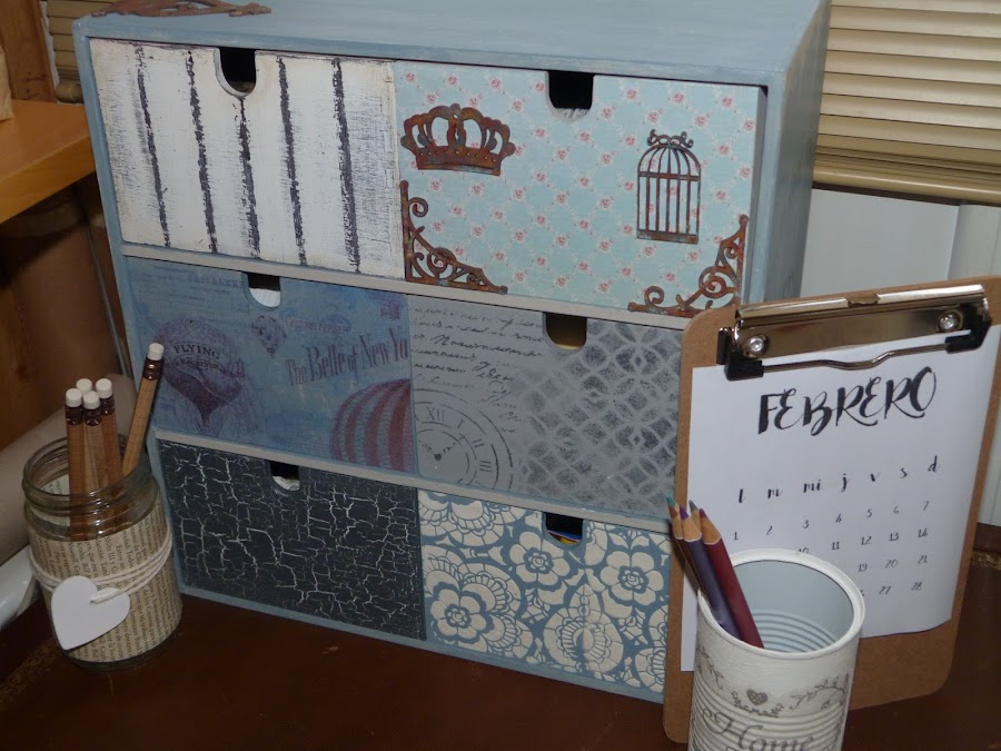 Una vez terminada la estructura exterior de la cajonera, empezamos con los cajones. Siempre hay que lijar, sobre todo los bordes para que los cajones abran y cierren sin atascarse. Cada uno de ellos lo he decorado de distinta manera y con distintos materiales y técnicas; en todos he mantenido, eso sí, la misma gama cromática: azules, blancos y crudos, añadiendo además algo de gris para resaltar un poquito.