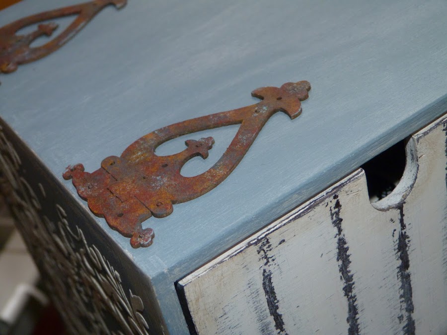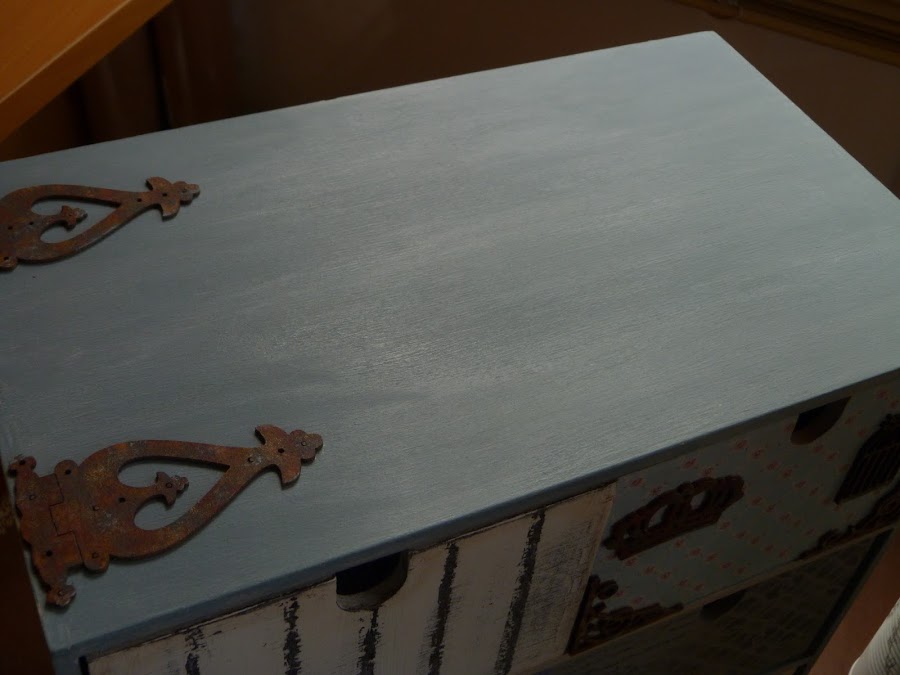 Para terminar la tapa, pinté dos bisagras de dm con acrílicas, haciendo un efecto oxidado sobre ellas. Para ello, se aplican con esponja, a toquecitos, distintos tonos: gris pizarra, marrón siena, rojo óxido, ocre y turquesa. Se van alternando los colores, superponiendo y mezclando unos con otros, hasta conseguir la apariencia oxidada que buscamos. Me gustan estas bisagras, porque simulan que la tapa superior de la cajonera pudiera abrirse.