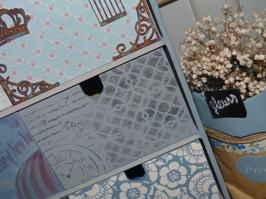 El último cajón está decorado igual que el lateral izquierdo de la cajonera: azul parís de base cubierto con relieve, utilizando una plantilla floral en este caso.