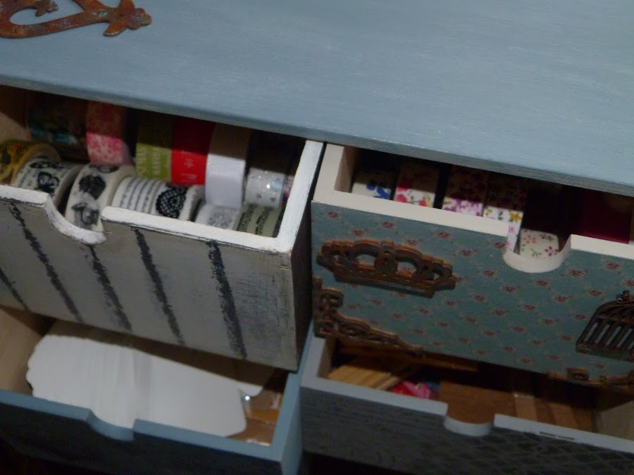 Quizá los cajones no parezcan amplios. Depende de para qué, por supuesto, pero en nuestro caso, que utilizamos tantas y tantas cosas (washis, tiradores, puntillas, perforadoras, pequeñas herramientas...) son estupendos para tener todo a mano y bien organizado, algo fundamental para trabajar.
