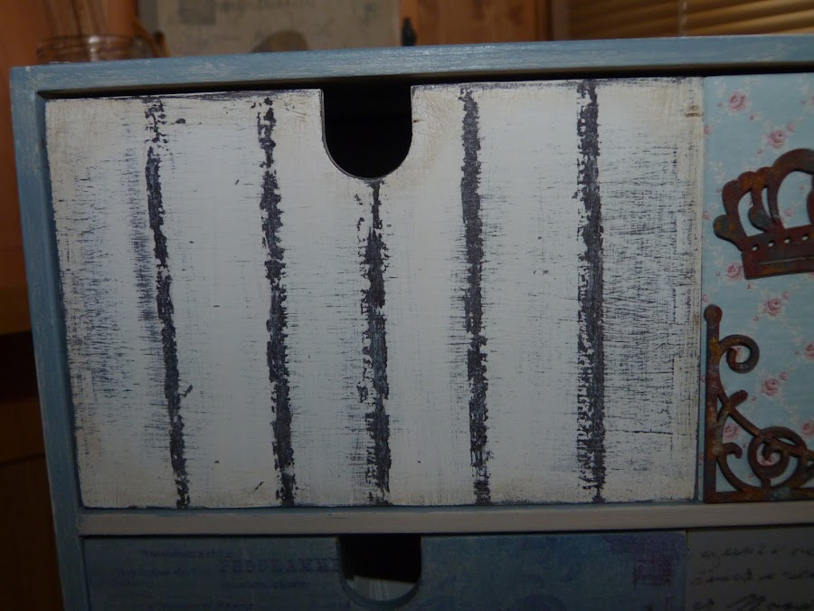 En el primer cajón he aplicado una base color chocolate; después he marcado líneas con vela y he vuelto a pintar en blanco.