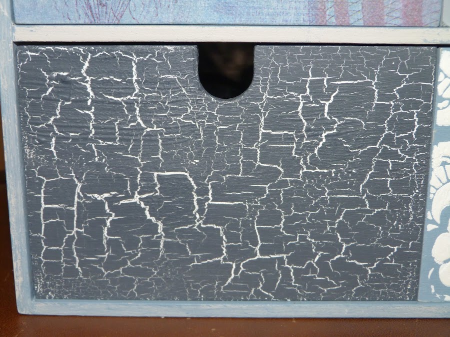 Con este es con el que he querido salir de los tonos claros para que no fuera todo tan plano. Para ello, lo he craquelado utilizando chalk paint blanca y gris oscuro.