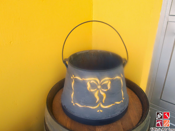 Sigo tuneando calderos y objetos metálicos ya que son muy agradecidos para decorarlos. Este me lo dieron, ya que su dueño lo tenía tirado y estaba en desuso, no tengo foto de como era originalmente, pero se había utilizado para llevar la leche de ordeñar y estaba muy, muy deteriorado. La base de abajo la tuve que cambiar porque estaba rota y roñosa, mi marido me hizo una nueva de metal, la soldó y después de una, dos y tres manos de limpieza para quitar pegotes, suciedad y demás lo lijé un poco y listo para decorarlo.
