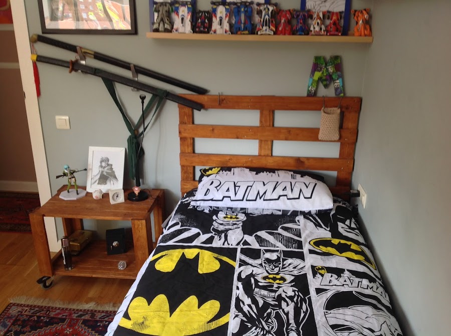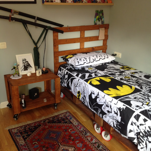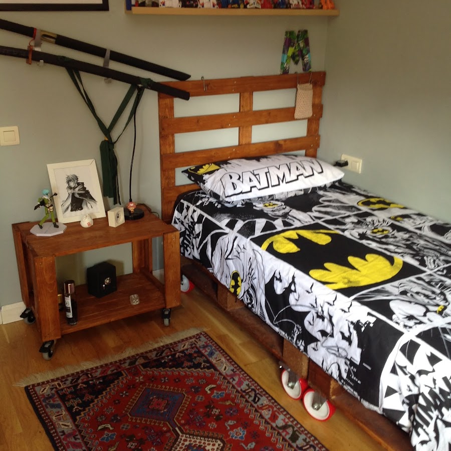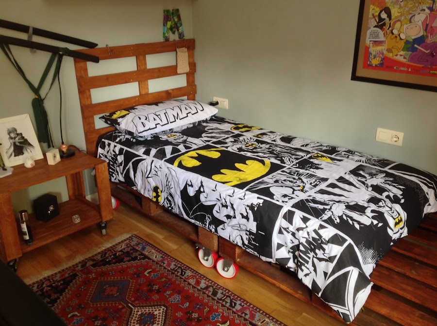 Luego le he puesto ruedas y le he añadido un cabecero que he sujetado a la pared, pues así puedo mover la cama con facilidad.