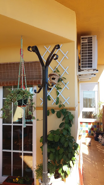 El perchero tampoco iba a ser menos, y darle al pincel en este balcón rodeada de preciosas macetas y con vistas al campanario de mi pueblo, no tiene precio...