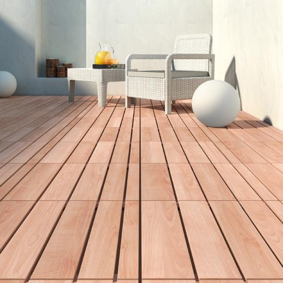 - Baldosas o lamas de madera tropical -Bangkirai, Pucté o Santa María- con acabado liso o ranulado y muy resistentes a la intemperie, a los hongos y a los insectos perforadores.