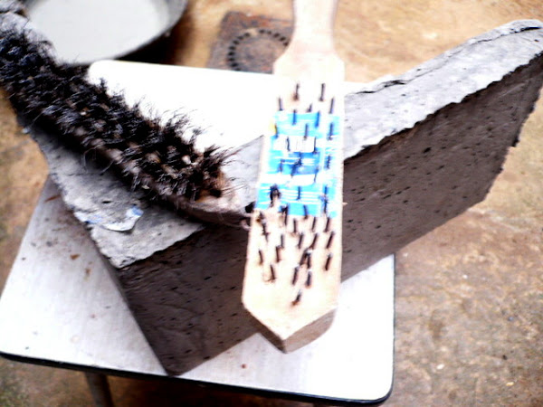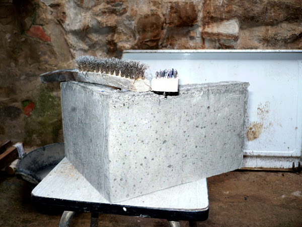 La pieza tal cual sale del molde. Si el molde esta bien hecho, y para facilitar el desmoldaje, nos va a dejar unas superficies muy lisas. Así que mediante un cepillo metálico, y otro que esta hecho con puntas aceradas (de autoconstruccion), vamos a imitar la rugosidad de la piedra arenisca, y de las marcas de cincel que se pueden ver en las piedras autenticas de los edificios antiguos.